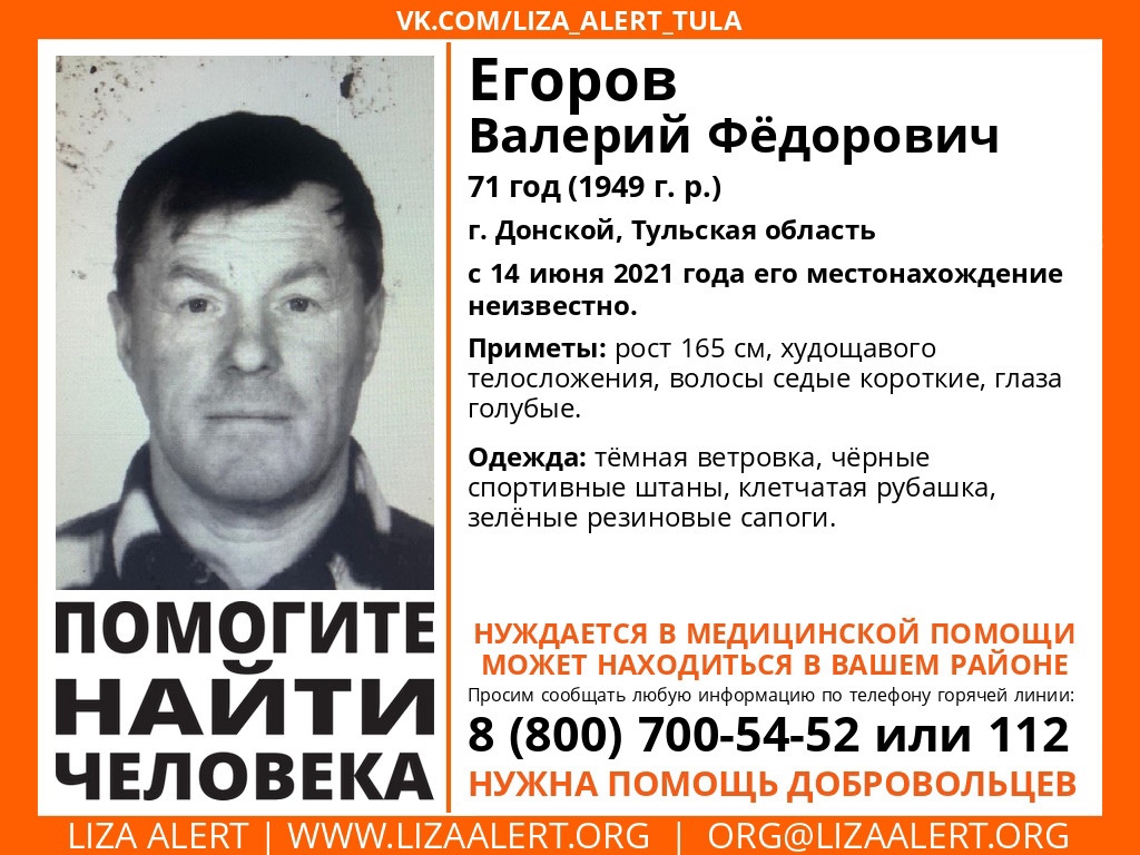 Из города Донской пропал Егоров Валерий Фёдорович, 71 год. Его местонахождение неизвестно с 14 июня 2021 года. Мужчина ростом 165 см, xудощавого телосложения, голубые глаза, седые волосы, короткая стрижка. Был одет в тёмную ветровку, чёрные спортивные штаны, клетчатую рубашку и зелёные резиновые сапоги.