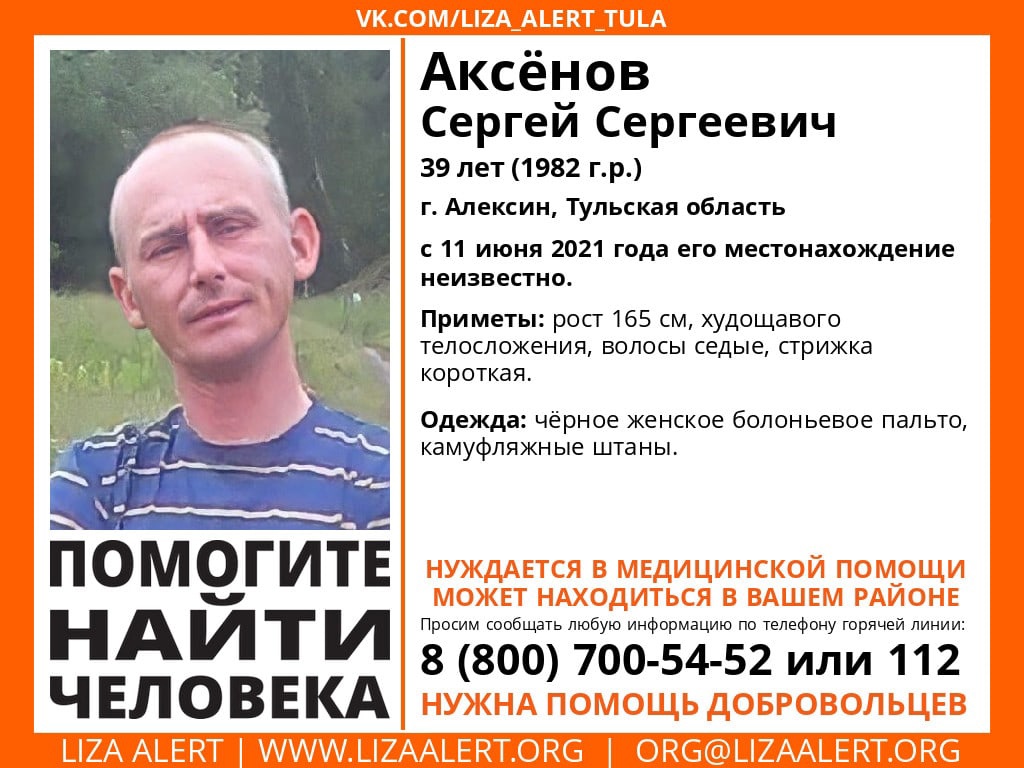 Аксёнов Сергей Сергеевич, 39 лет, пропал из города Алексин Тульской области. Его местонахождение неизвестно с 11 июня 2021 года. Это мужчина ростом 165 см, худощавого телосложения, глаза светлые, волосы седые, короткая стрижка. Был одет в чёрное женское болоньевое пальто, камуфляжные штаны, один кроссовок.