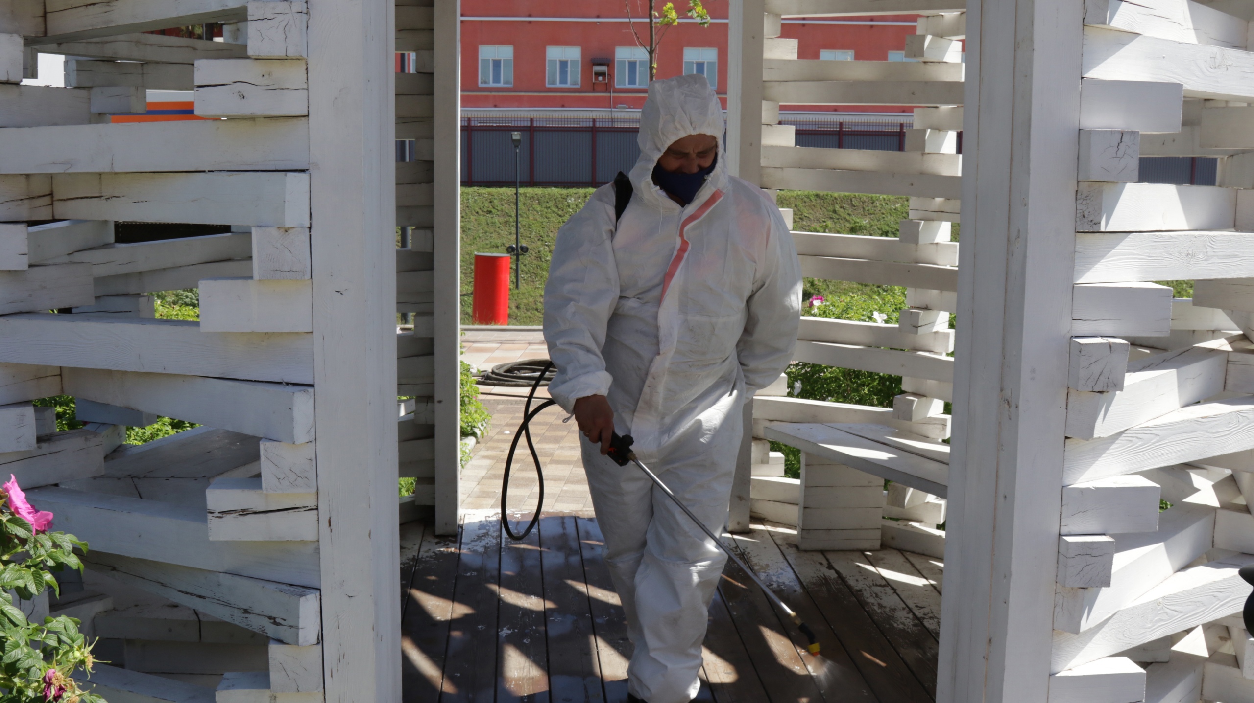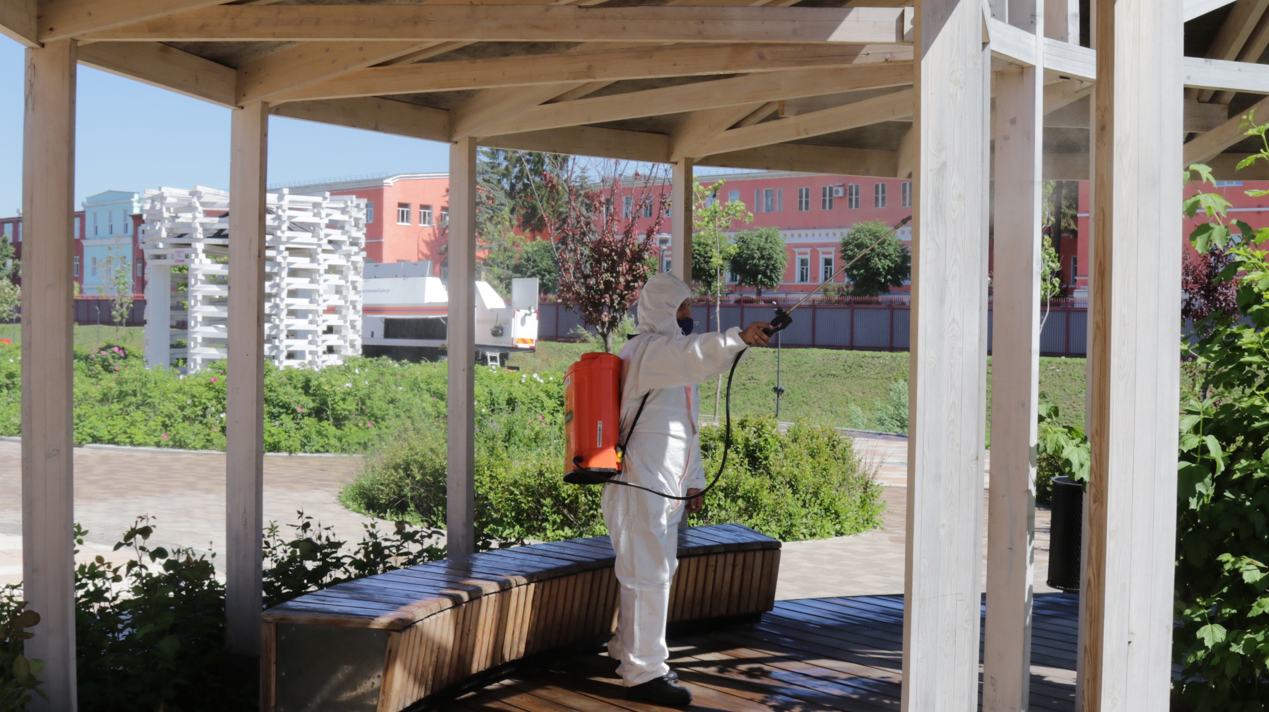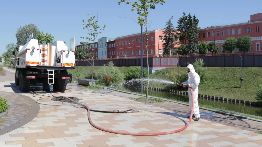 Для дезинфекции применяют раствор гидрохлорита натрия, которым будут обрабатывать тротуарную плитку, скамейки, детские площадки, и все поверхности, к которым прикасаются люди. Плюс этого раствора в том, что он сохраняет свои свойства на открытом воздухе в течение суток и «убивает» различные микробы, в том числе и короновирусной инфекции.
