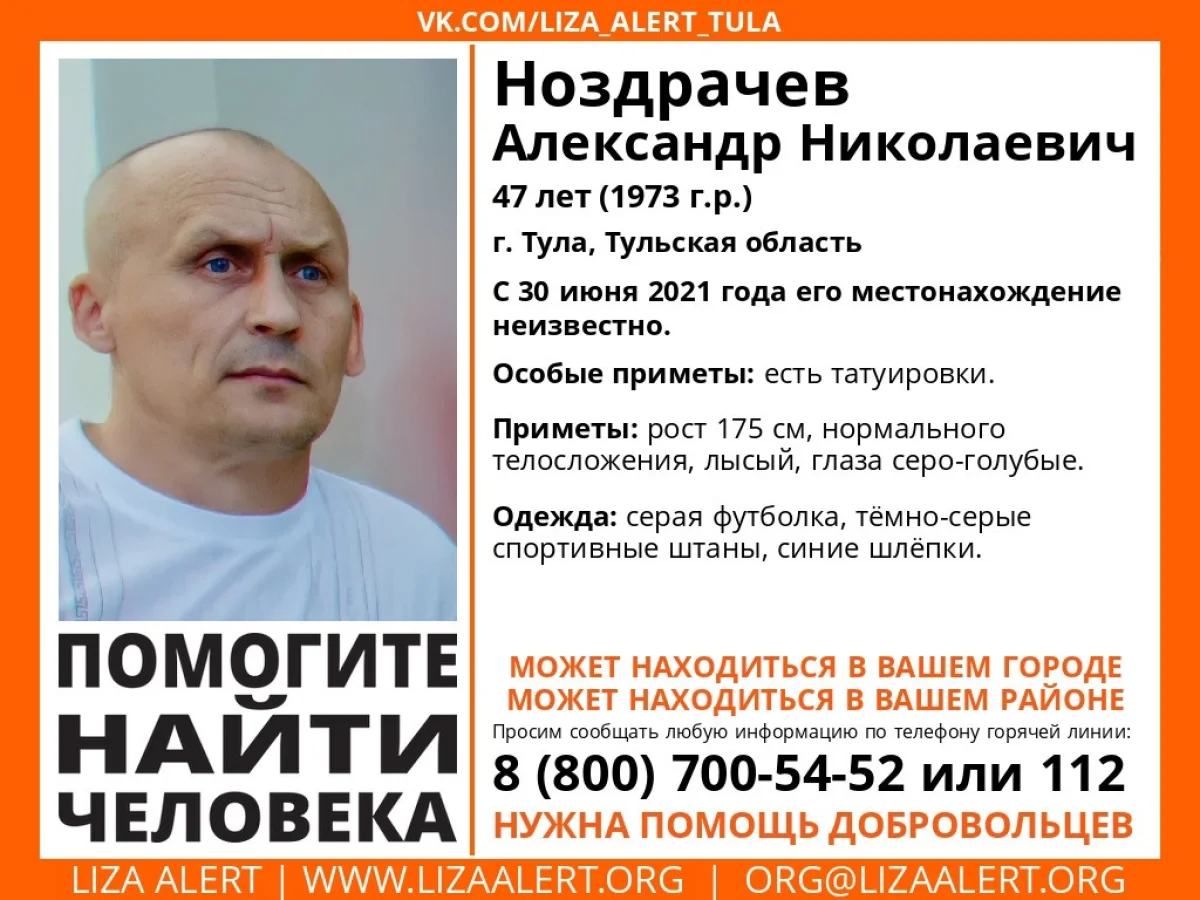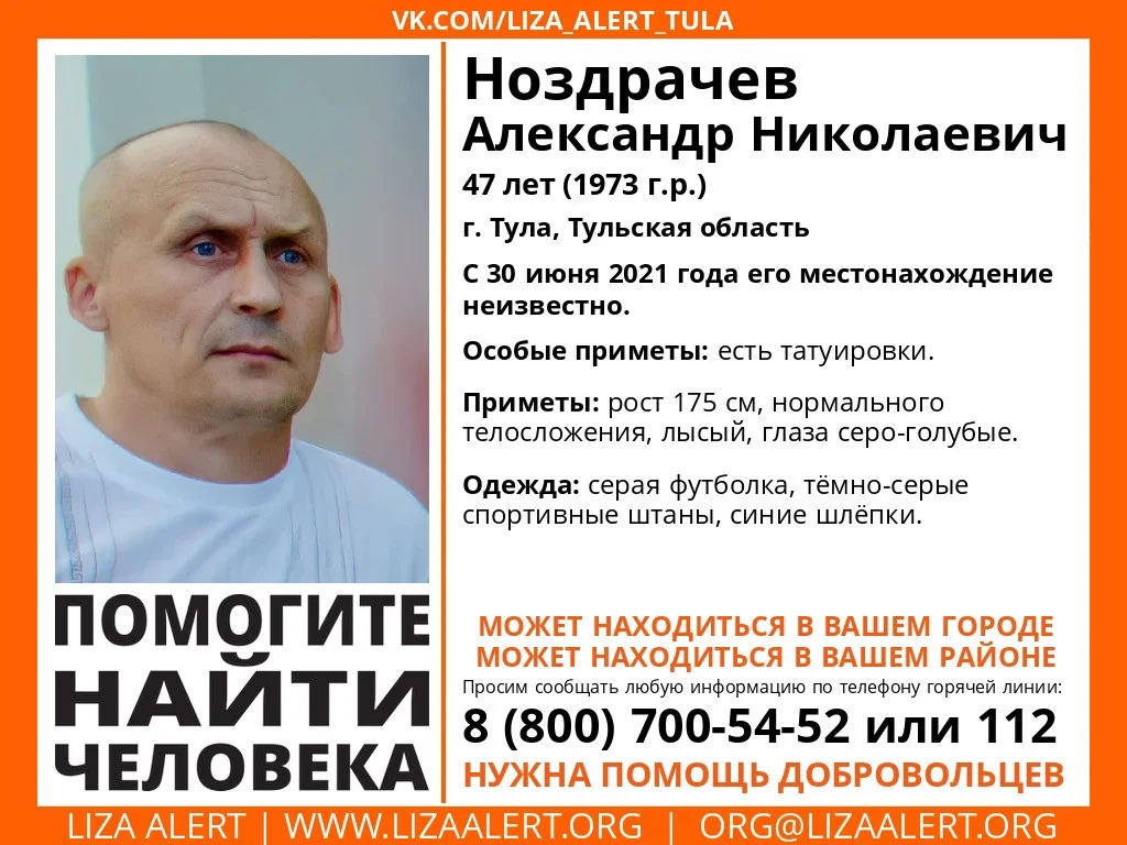 В Туле ищут пропавшего мужчину, местонахождение которого неизвестно с 30 июня. Пропавший, 47-летний Александр Николаевич Ноздрачев, ростом 175 см, нормального телосложения. Серо-голубые глаза, без волос. Есть татуировки.