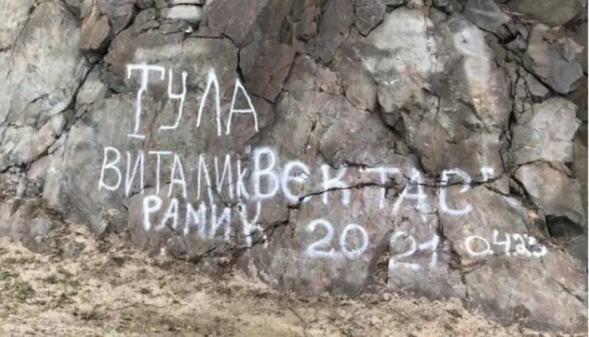 Трое молодых людей (предположительно) оставили после себя на скалах вдоль оживленной трассы «памятную» надпись по типу: «Здесь были Иванов и Сидоров». В нашем случае некто Виталик, Рамик и Вектас решили увековечить дату своего посещения Карелии — 23 апреля текущего года.