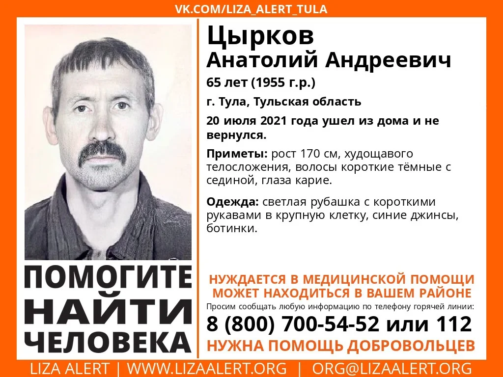 20 июля около 18:00 ушёл из дома и не вернулся 65-летний Анатолий Андреевич Цырков из Тулы. С тех пор о его местонахождении ничего неизвестно. Поисковики отряда «ЛизаАлерт» просят жителей региона помочь в розыске. Мужчина может нуждаться в медицинской помощи.