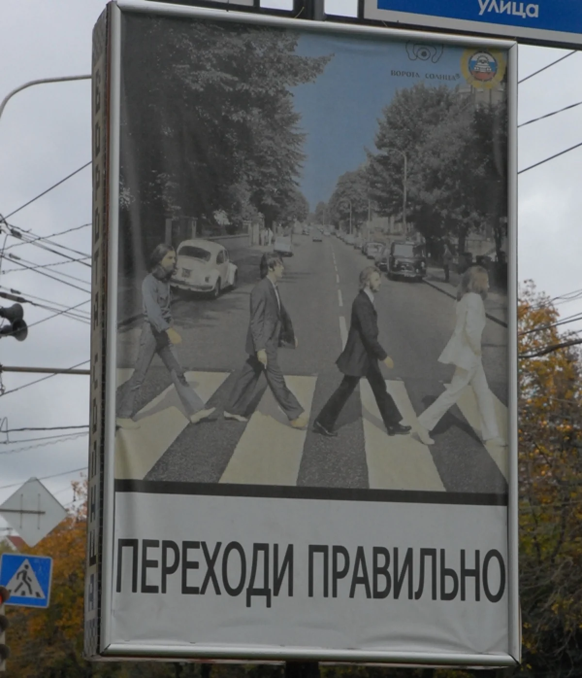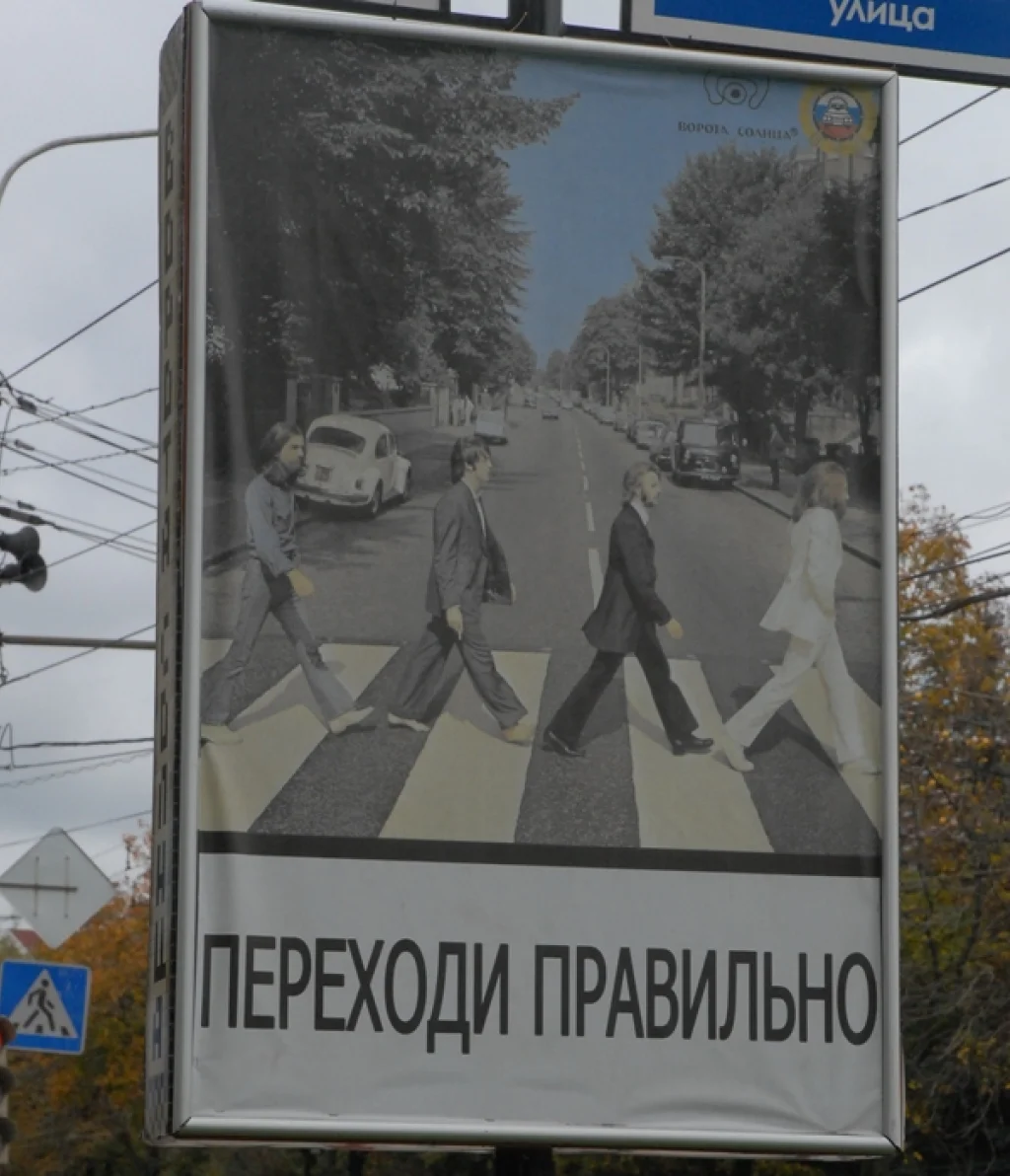 Группа «Битлз» наглядно показывает как правильно переходить дорогу возле остановки «Стадион». Надо отметить, что социальная реклама вписалась очень гармонично.