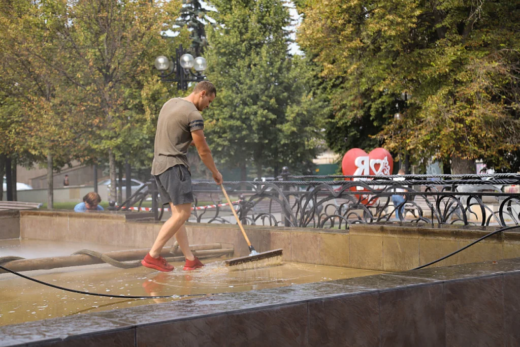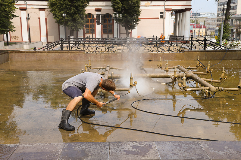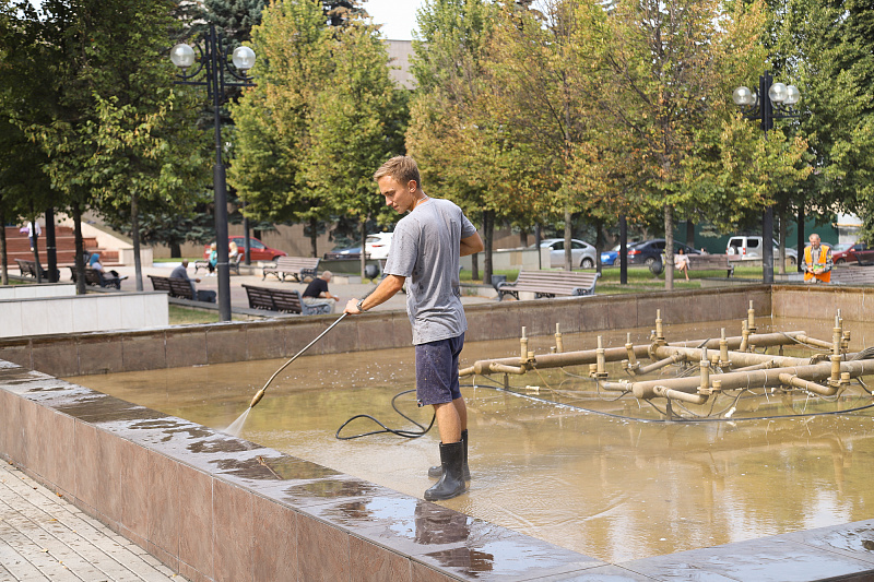 Воду из чаш фонтана слили, сам фонтанный комплекс очищают от мусора. Работы планируют завершить до конца текущей недели.