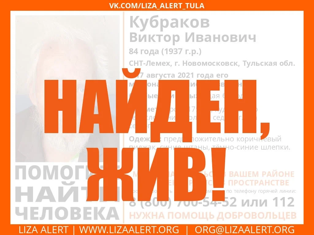 поисковики отряда «ЛизаАлерт» объявили о том, что 84-летний мужчина, которого искали с 17 августа после его пропажи из СНТ-Лемех в Новомосковске, найден живым.