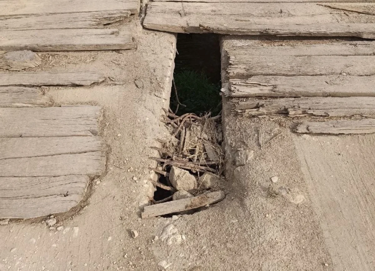 Это деревянный мост, который является одной из немногих переправ поблизости, и теоретически предназначен для автомобилей, но жители говорят - по нему не то что машинам опасно ездить, по нему опасно даже ходить пешком.
