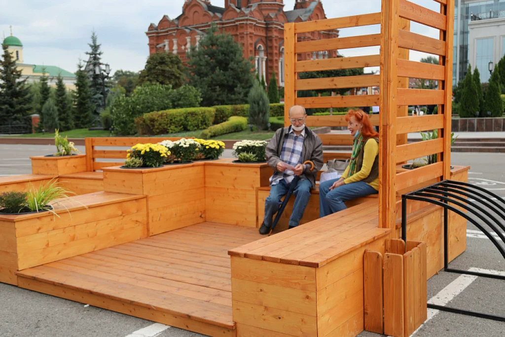 В Туле на центральной площади устанавливают парклеты - деревянные платформы со скамейками и цветочными композициями, которые предназначены для отдыха горожан в теплое время года. Парклеты выполняют роль небольших зон отдыха, и всего на площади Ленина поставили шесть таких деревянных платформ и дополнили их декоративными композициями из хвойных и цветочных культур.