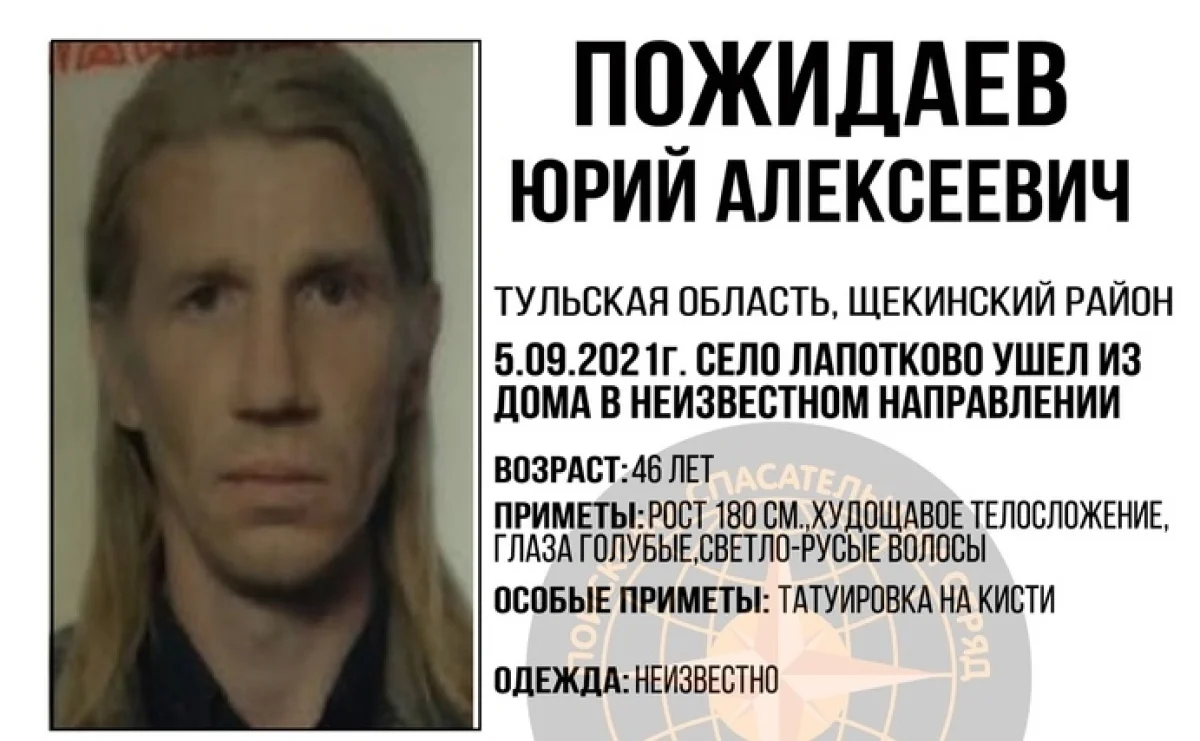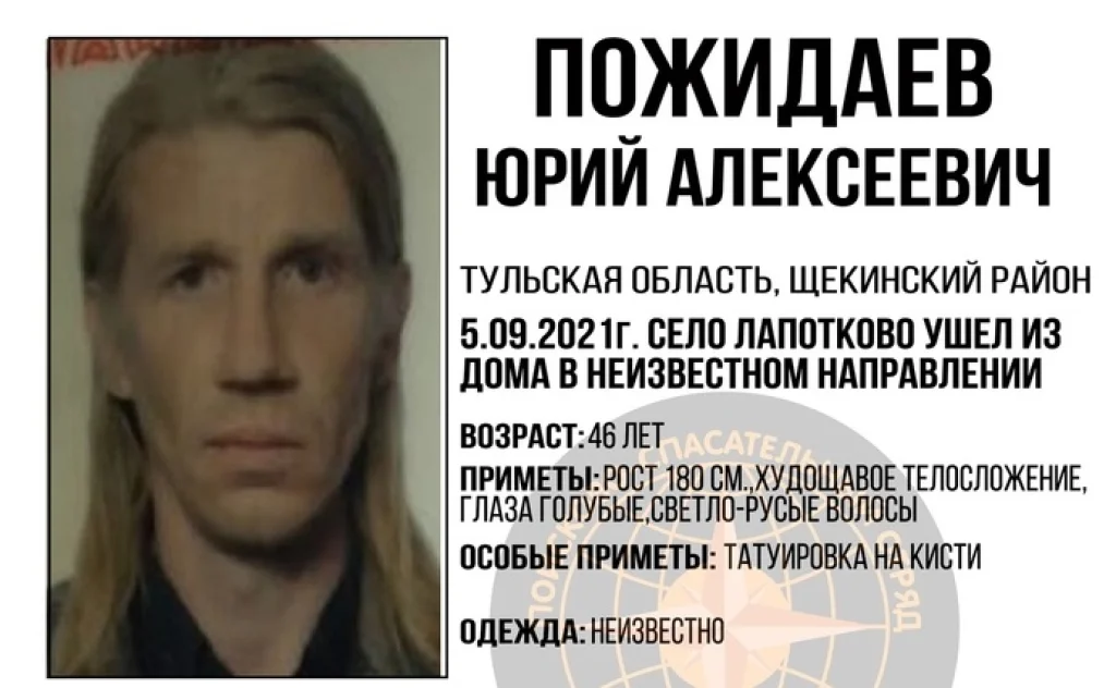 В Щекинском районе тульской области из села Лапотково пропал 46-летний мужчина, Пожидаев Юрий Алексеевич 46 лет. 5 сентября он ушел из дома в неизвестном направлении.
