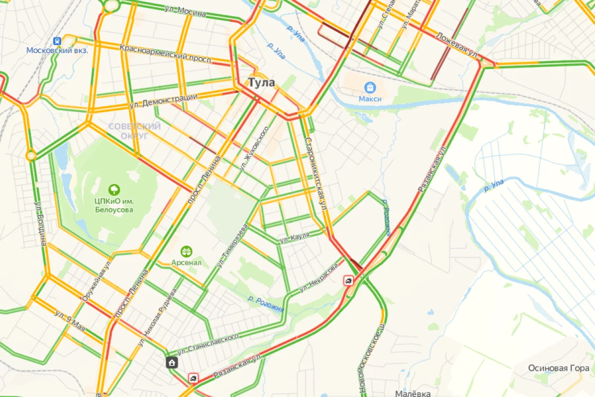 На данный момент пробка протянулась почти на 6 километров от улицы Ложевой до Городского переулка, уровень затора - красный.