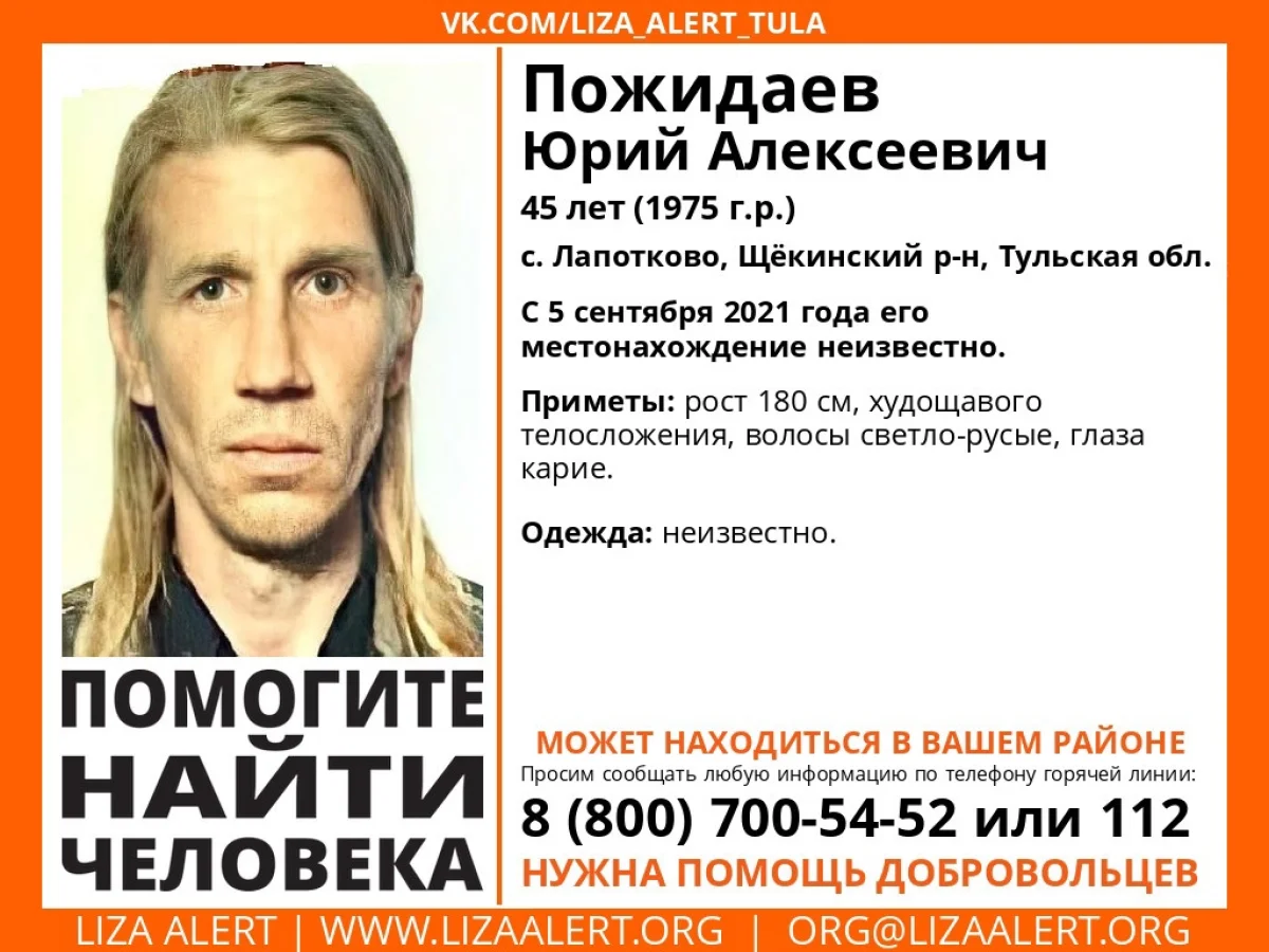 В Тульской области продолжаются поиски 45-летнего Юрия Алексеевича Пожидаева, который пропал из села Лапотково Щекинского района Тульской области 5 сентября 2021 года. С тех пор ничего не было известно о его местонахождении.
