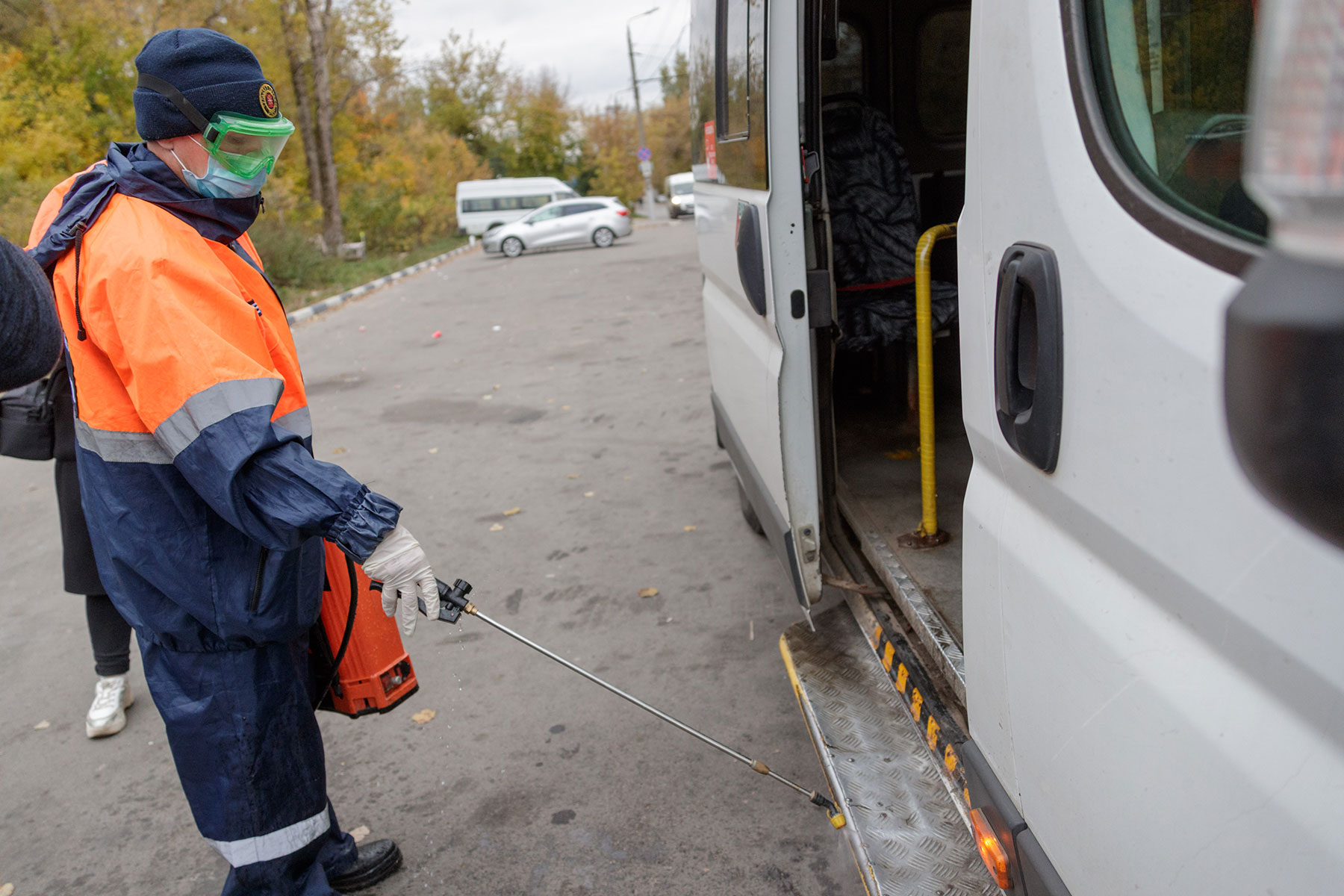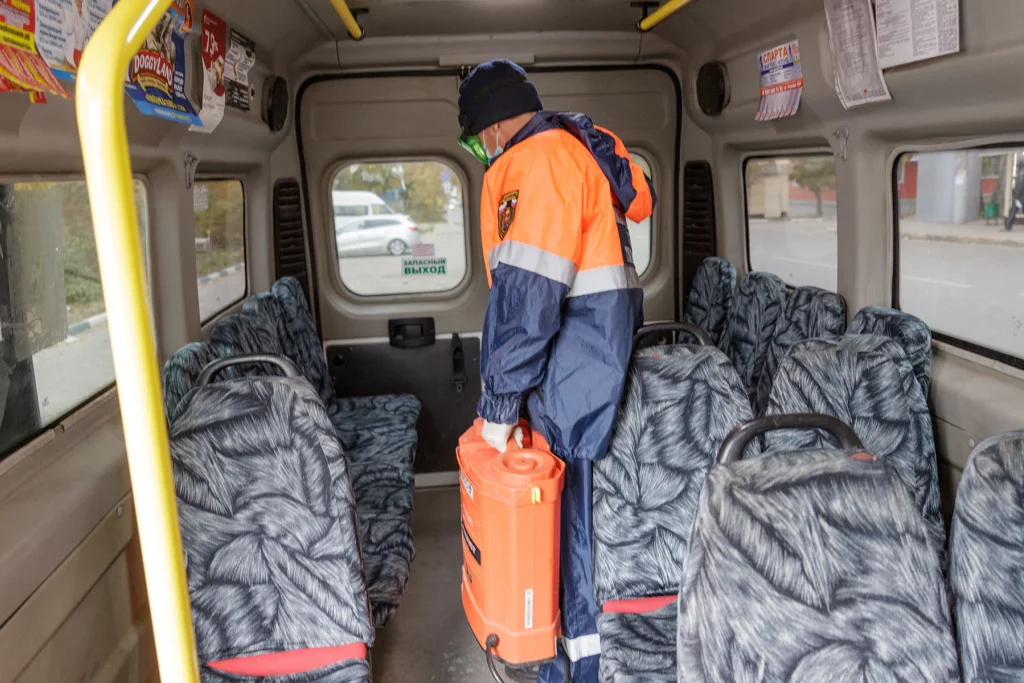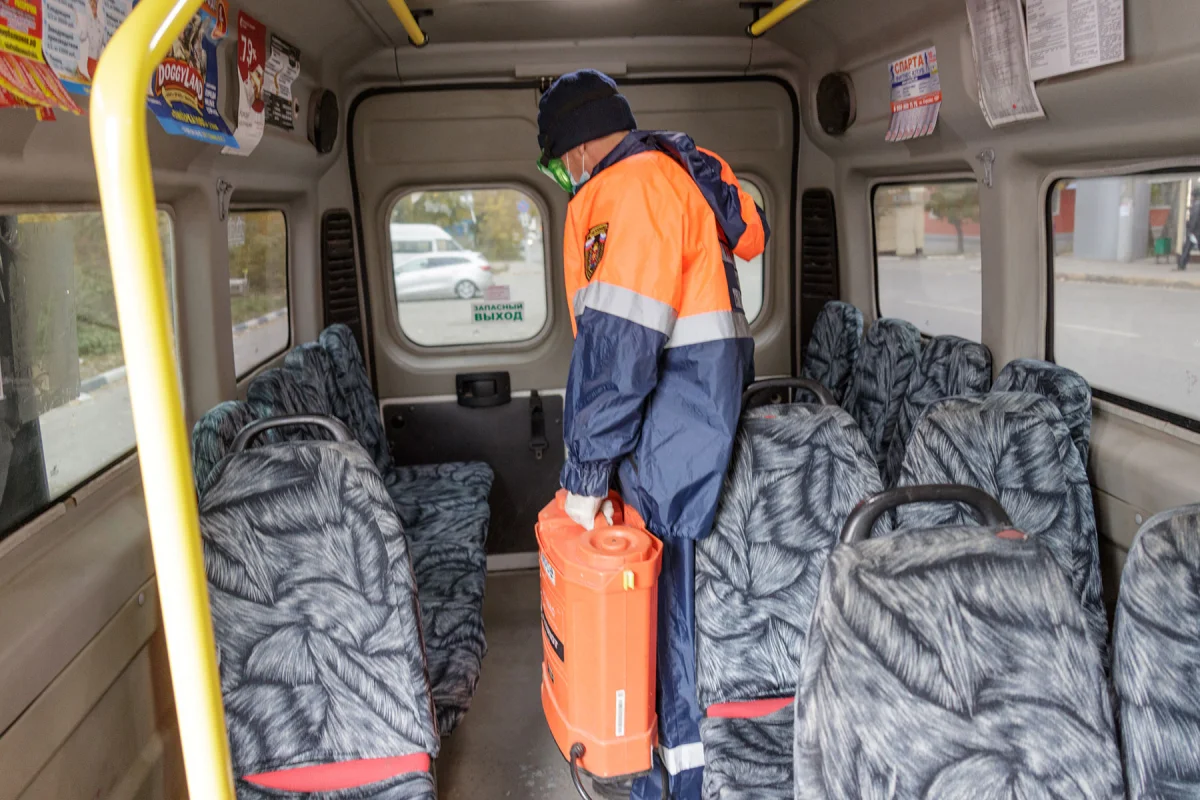 Для дезинфекции используют специальный хлорный раствор, безопасный для человека. На обработку до 90 единиц транспорта в течение дня требуется около 40 литров раствора.