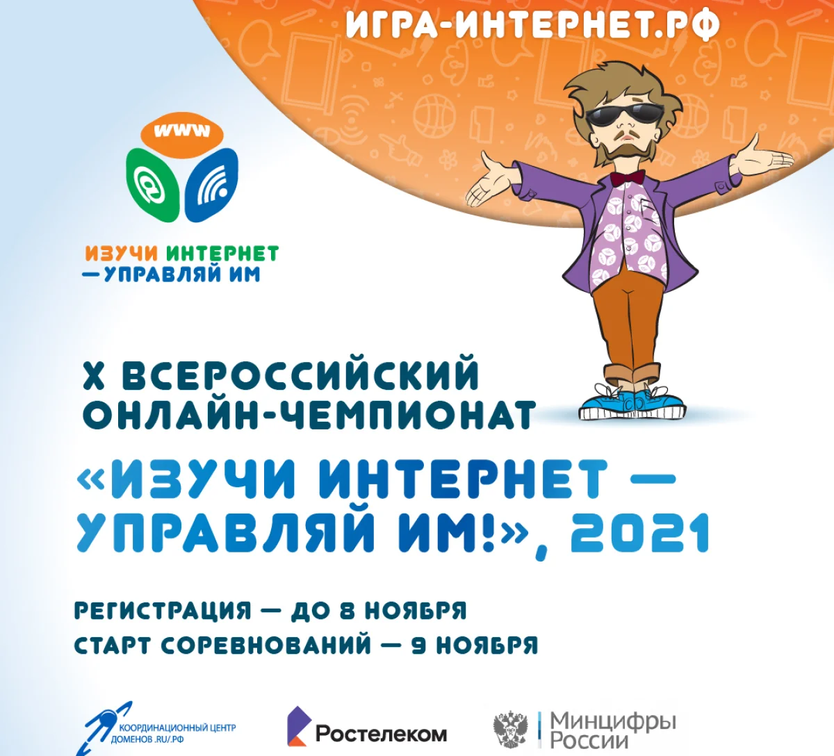 Продолжается регистрация участников на X Всероссийский онлайн-чемпионат «Изучи интернет — управляй им!». Соревнования для школьников и студентов до 18 лет проводят «Ростелеком» и Координационный центр национального домена сети интернет при поддержке Министерства цифрового развития, связи и массовых коммуникаций РФ и Роскомнадзора. Онлайн-чемпионат пройдет 9–25 ноября 2021 года на официальном сайте проекта игра-интернет.рф. Регистрация участников продлится до 8 ноября включительно. Объявление результатов намечено на 9 декабря.