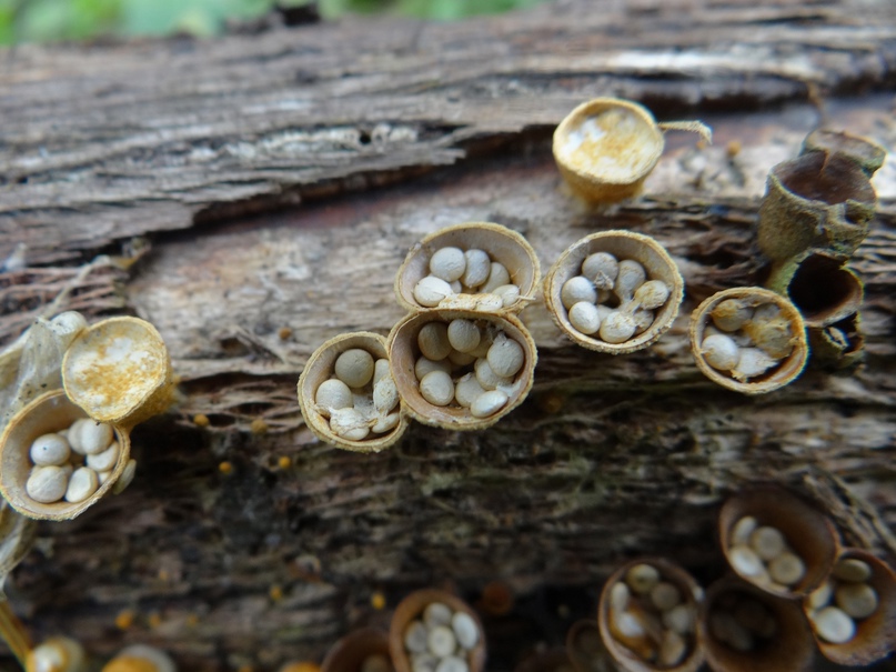 Бокальчик гладкий (Crucibulum laeve) похож на крошечные птичьи гнёзда и растет большими группами на гниющих ветках предпочитая хвойные породы. Плодовое тело меньше 1 см, мохнатое, у молодых грибов сверху затянуто тонкой буроватой плёнкой. Затем плёнка рвётся и на дне бокальчика становятся видны сероватые спорохранилища, похожие на птичьи яйца в гнезде. Что интересно, этот гриб - "родственник" всем знакомого шампиньона, причем встречается на всех континентах, кроме Антарктиды.