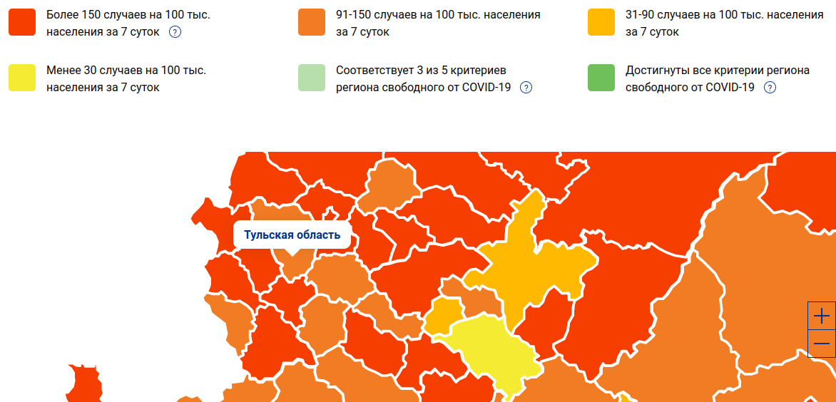 В Тульской области ухудшилась общая ситуация с коронавирусом, соответствующие данные появились на сайте Стопкоронавирус.рф. Так, если ранее наш регион был обозначен темно-желтым цветом (31-90 случаев на 100 тысяч населения за 7 суток), то теперь он перешел в «оранжевую» категорию, то есть уровень заболеваемости повысился до 91-150 случаев на 100 тысяч населения за 7 суток.