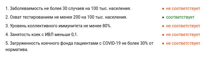 Напомним, также, что на этом сайте уровень благополучности регионов в плане коронавирусной обстановки оценивается по пяти критериям, из которых Тульская область на сегодня соответствиет только одному — Охват тестированием [на коронавирус] не менее 200 на 100 тысяч населения.
