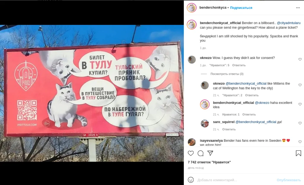 «Бендер на билборде. @cityadmtularu, могли бы вы выслать мне пряников? А как насчет билета на самолет? Я до сих пор шокирована его популярностью! Spaciba!» — написала хозяйка кота в своем Инстаграме на официальной странице кота Бендера.