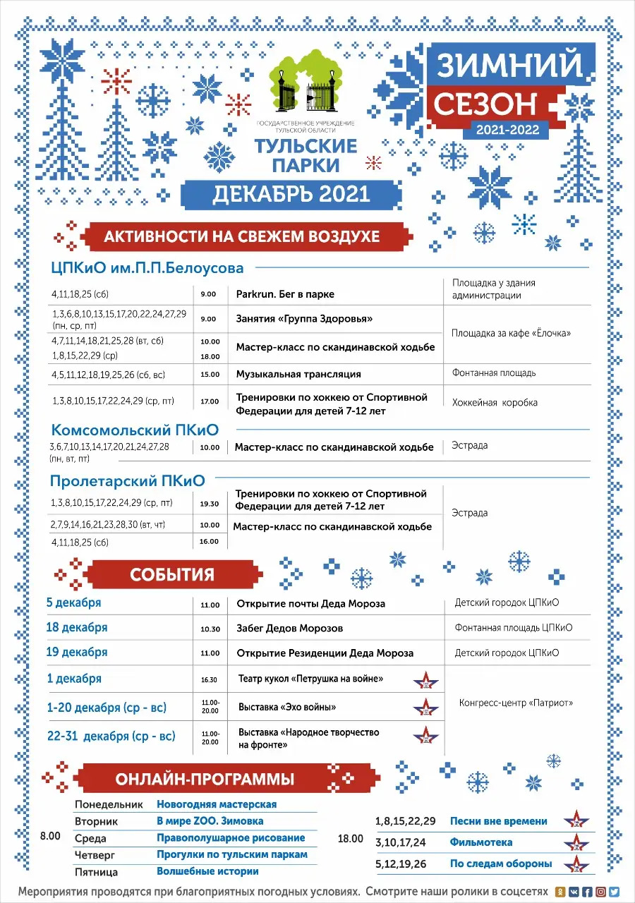 Онлайн-мероприятия будут представлены обучающими и развлекательными занятиями в форме видео-роликов в социальных сетях. Это уже знакомые тулякам «Правополушарное рисование», «Новогодняя мастерская», «В мире ZОО. Зимовка», и новые форматы - «Прогулки по тульским паркам» и «Волшебные истории». В социальных сетях парка «Патриот» пройдут «По следам Обороны», «Песни вне времени» и «Фильмотека».