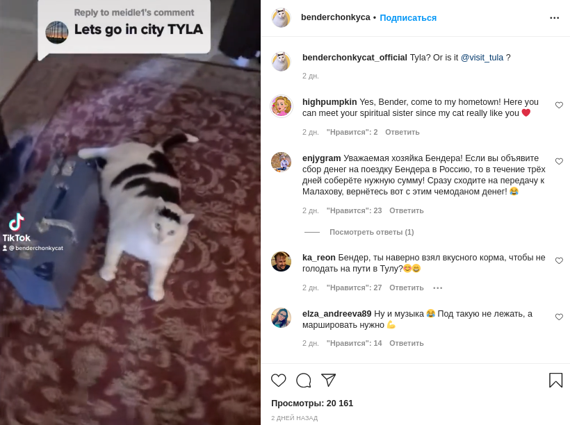 Пост с обращением в официальном аккаунте кота Бендера более 8 000 лайков и сотни комментариев, среди которых отметились и туляки.
