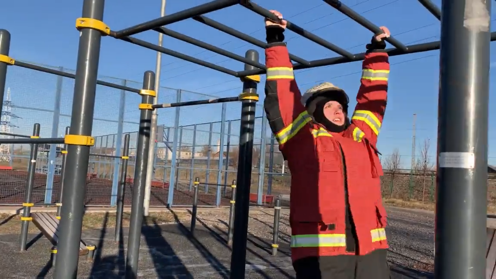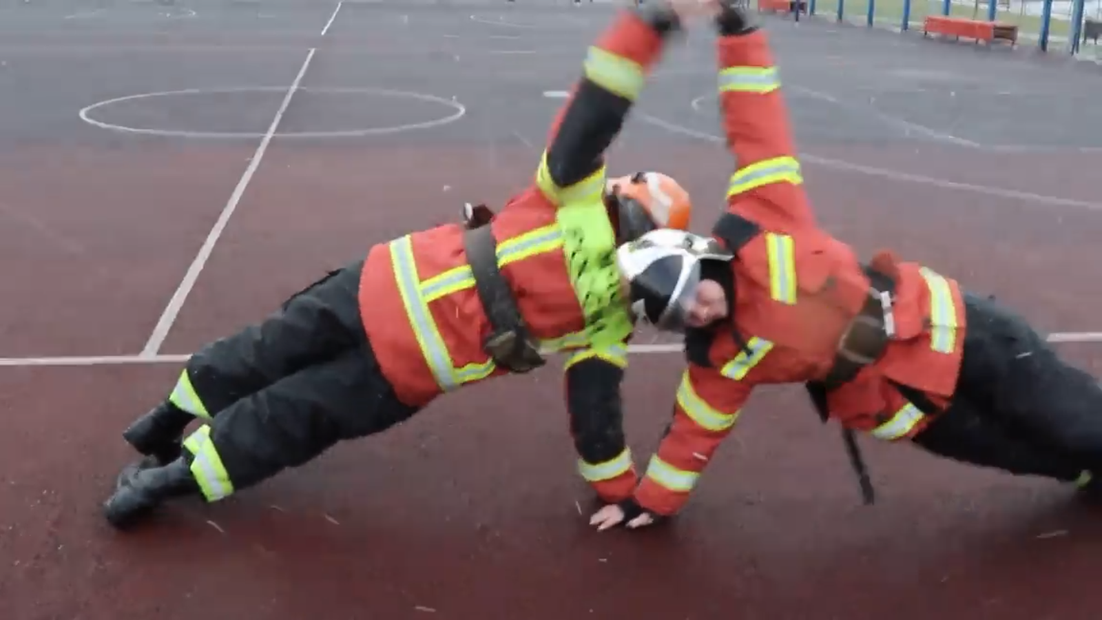 В рамках флешмоба четыре девушки в реальной боевой одежде пожарного на открытой спортплощадке под мокрым снегом выполняли упражнения на на силу, выносливость и ловкость — приседали, поднимали 16-килограммовые гири, отжимались, подтягивались и даже делали «колесо».
