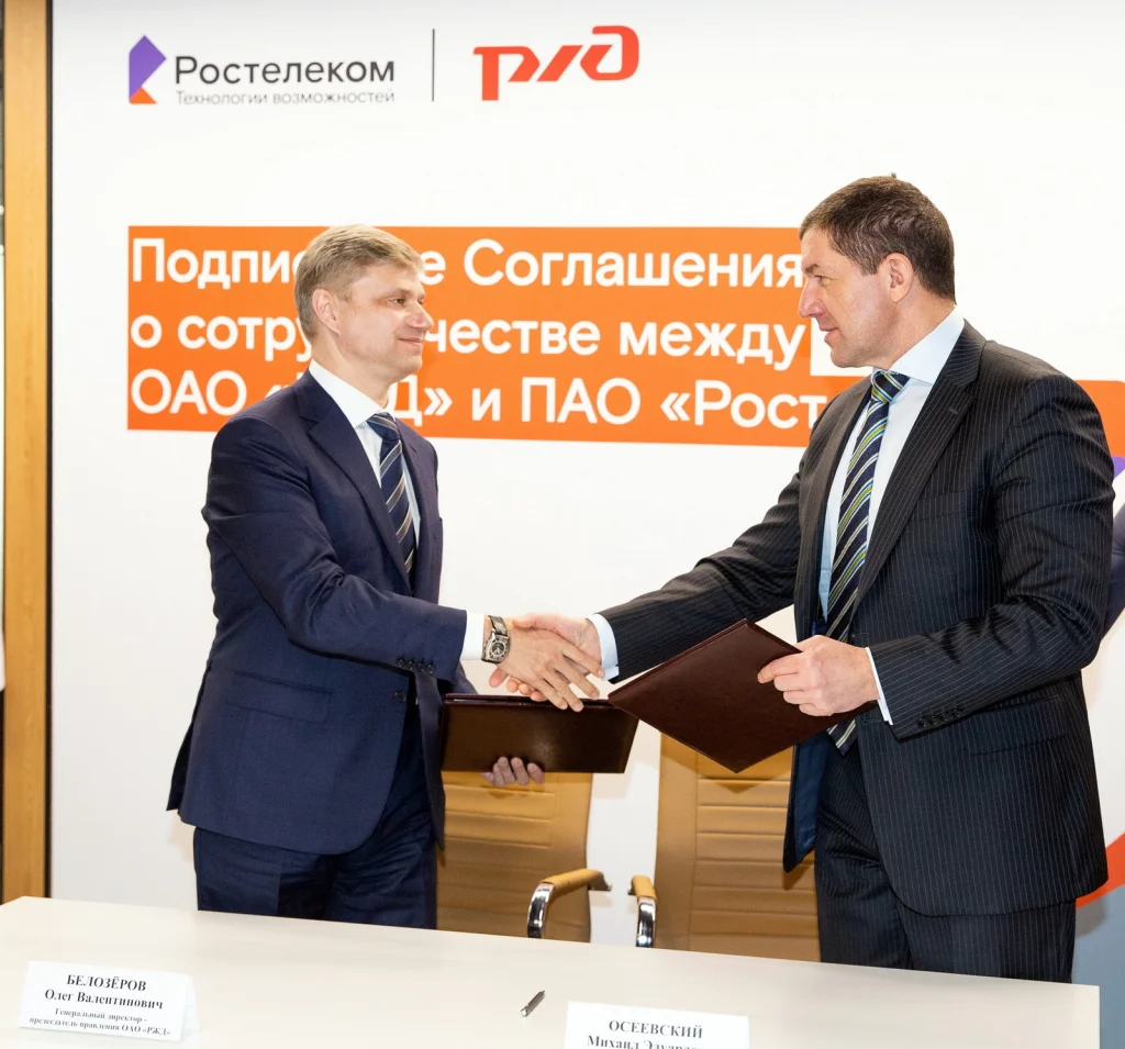 ОАО «Российские железные дороги» (РЖД) и ПАО «Ростелеком» заключили четырехлетнее соглашение о сотрудничестве в сферах информационной безопасности, развития сетей связи и повышения энергоэффективности железнодорожного холдинга. Документ подписали генеральный директор — председатель правления РЖД Олег Белозёров и президент «Ростелекома» Михаил Осеевский.