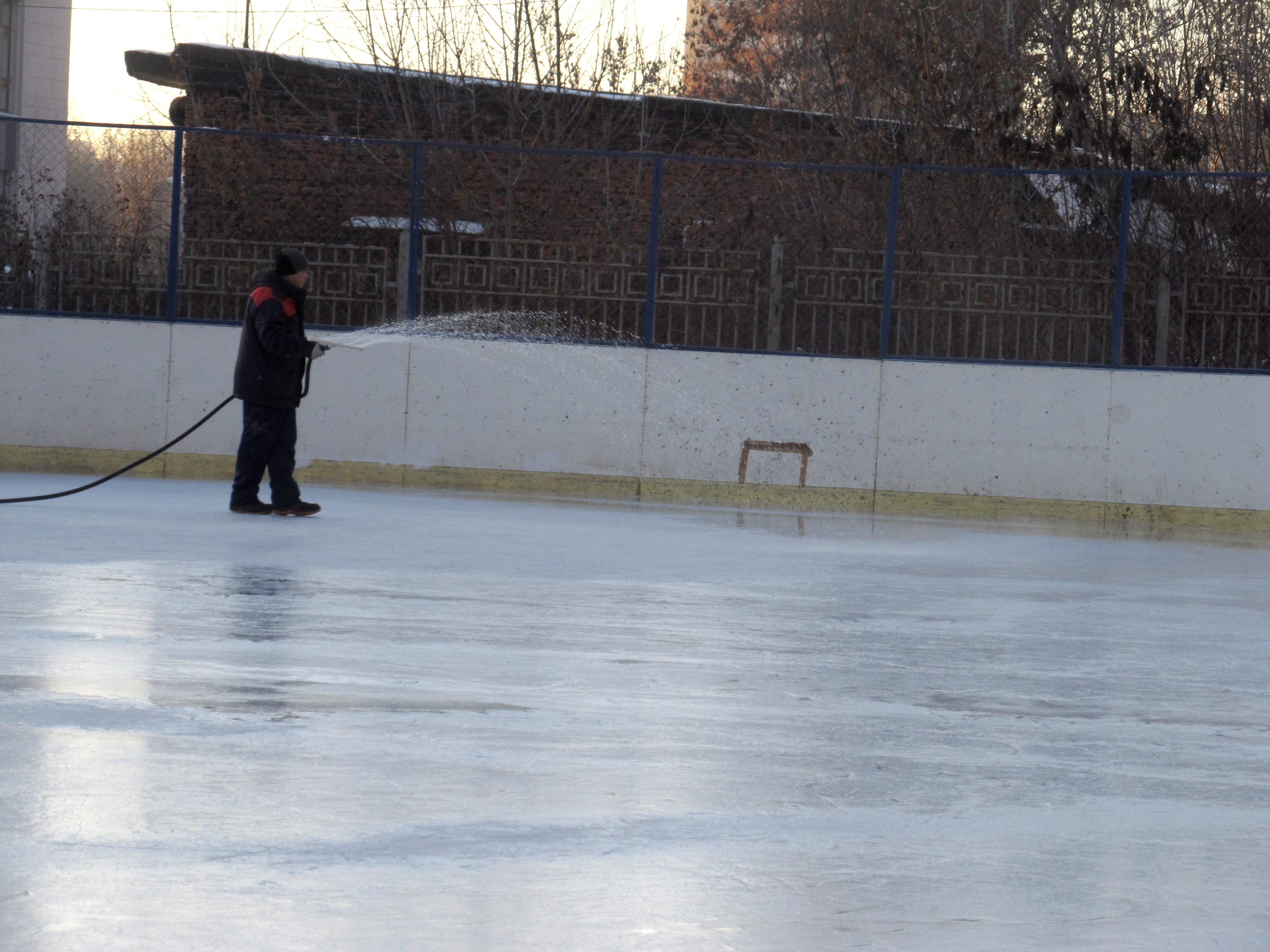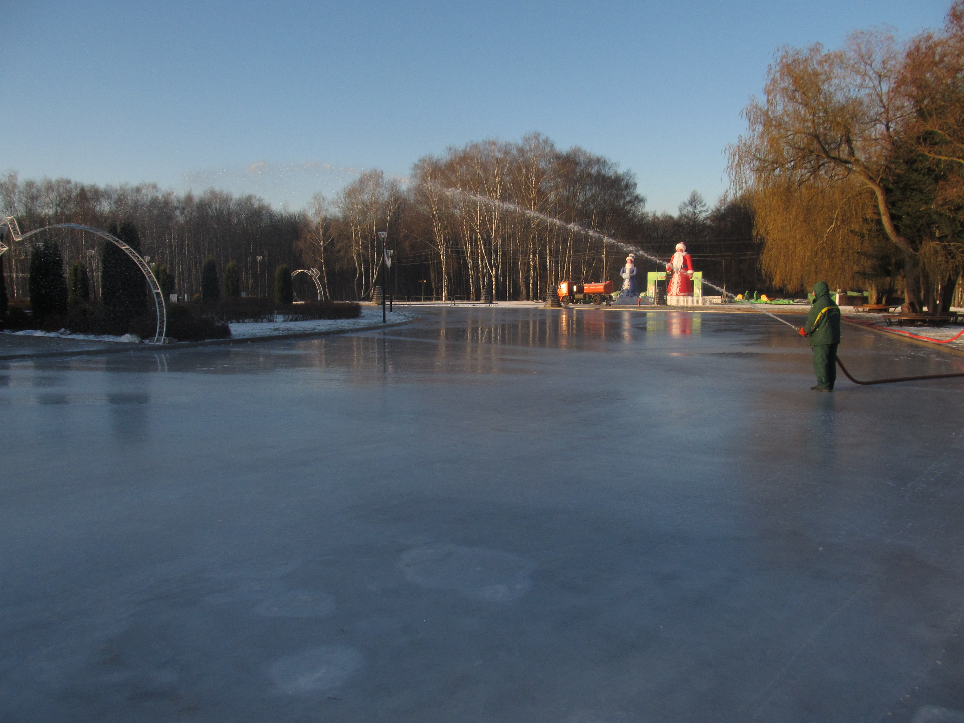 В процессе запуска (запланирован на 18 декабря). Лед естественный. Освещение, музыка. Пока заливается основное зеркало. Как только оно застынет окончательно, приступят к заливке Рябиновой аллеи, чтобы довести площадь катка до прошлогоднего.