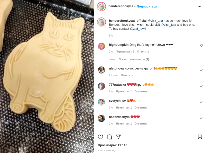 Отношения кота Бендера из Австралии и Тулы продолжают развиваться — на этот раз Тульский музей чаепития пошел дальше и создал печатную доску для пряника с изображением австралийского кота. Видео с процессом изготовления пряника выложила в своем аккаунте Нелла, хозяйка Бендера, прокомментировав: