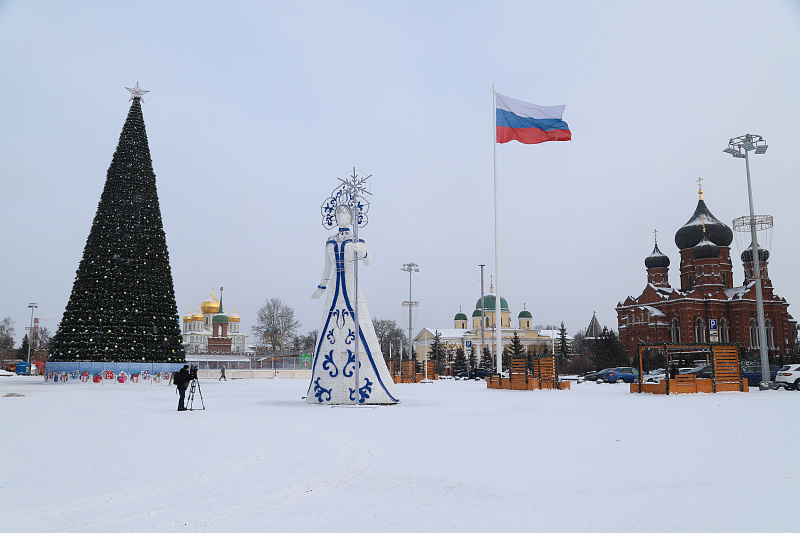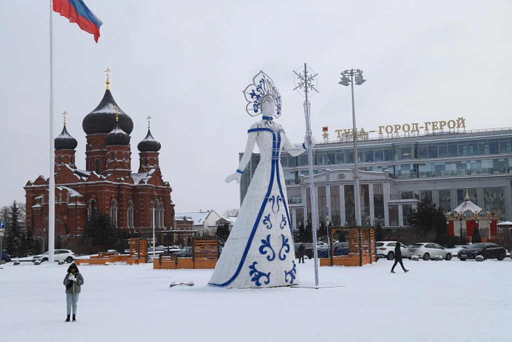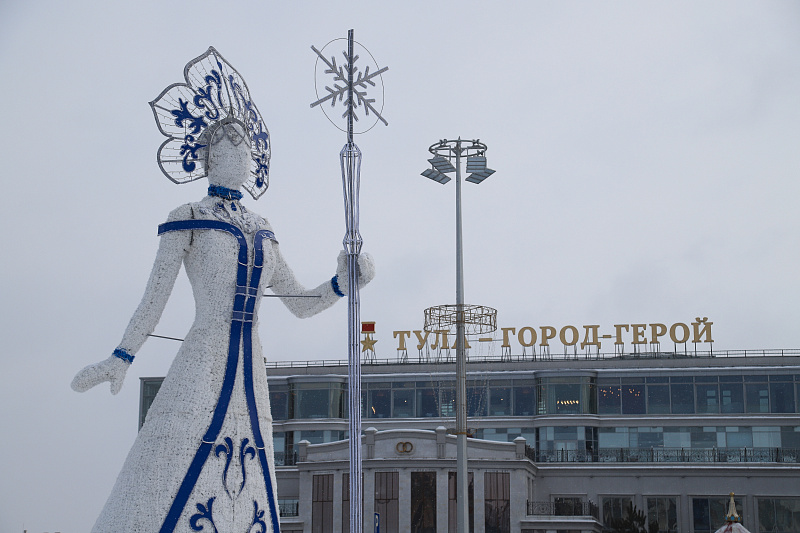 В центре Тулы, на площади Ленина устанавливают 10-метровую Снегурочку, а украсит гигантскую фигуру длинный шлейф из гирлянд в виде звездного неба, а также украшения на платье.