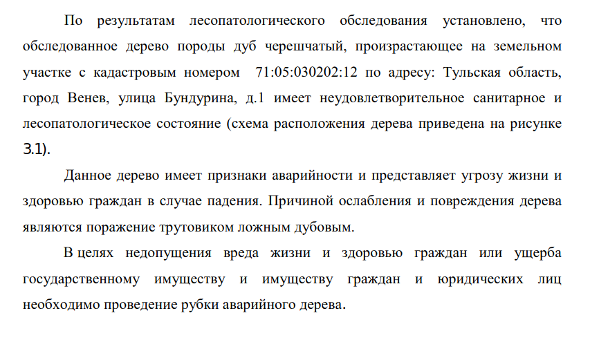 Макаров предоставил заключение от ФБУ «Рослесзащита», в котором говорится, что дерево поражено трутовиком ложным дубовым, находится в аварийном состоянии и угрожает жизни и здоровью граждан. В заключении также указывалось, что дерево настоятельно рекомендуется спилить.