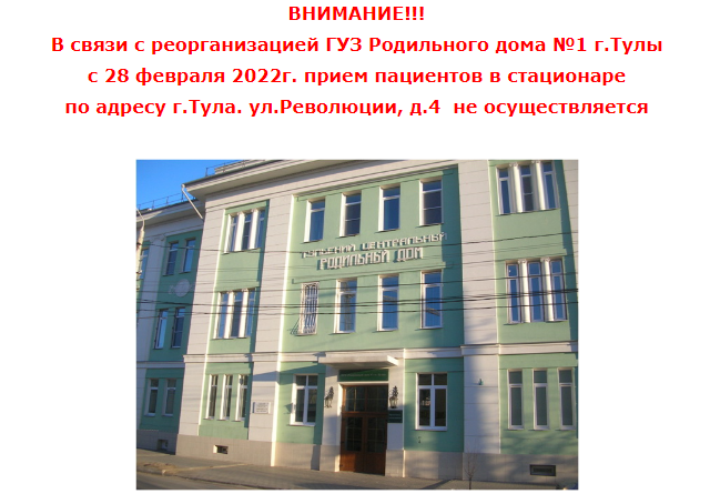 В Туле из-за реорганизации закрылся Родильный дом № 1 имени В.С. Гумилевской. На сайте учреждения сообщается, что с 28 февраля 2022 года прием пациентов на улице Революции больше не осуществляется.