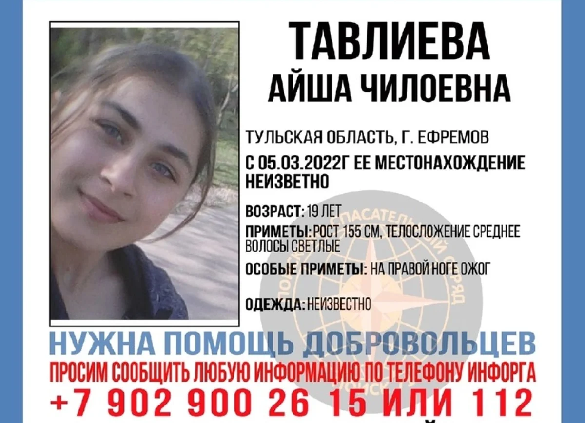 В Ефремове Тульской области продолжаются поиски 19-летней девушки, которая пропала без вести 5 марта. Тавлиева Айша Чилоевна вышла из дома и не вернулась, с тех пор ее местонахождение не известно.
