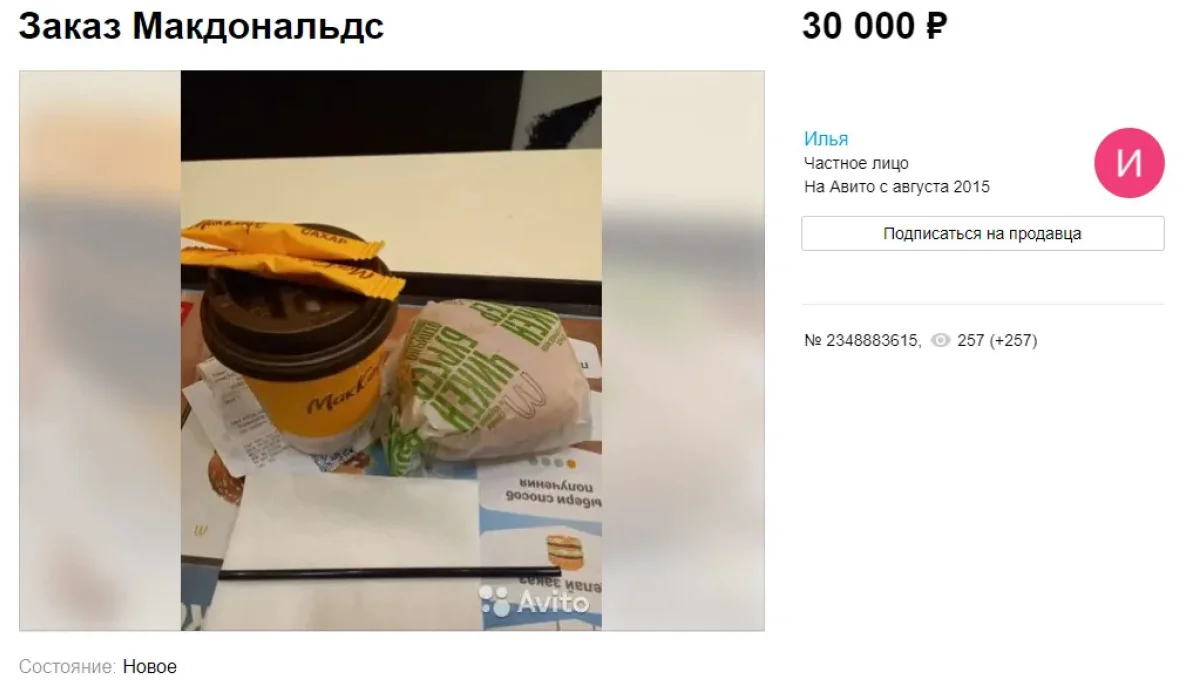 После того, как накануне, 8 марта, сеть ресторанов быстрого питания «Макдональдс» сообщила о временном закрытии своих заведений на территории России на фоне спецоперации на Украине, многие жители Тульской области и других регионов решили не терять даром время и выложили на сайте бесплатных объявлений целый ряд предложений. Продают упаковки от продукции «Макдональдс», коллекционные товары и саму продукцию. При этом цены выставляются такие, что впору заподозрить авторов в иронии: