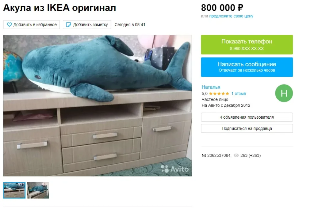 Предприимчивая тулячка выставила на продажу акулу из IKEA за 800 тысяч рублей
