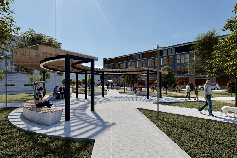 «Литературный» сквер появится на улице Союзной: его начали обустраивать еще в прошлом году. Здесь планируются открытая площадка со сценой-перголой для проведения тихих мероприятий, зона отдыха с теневыми навесами, детская площадка и беседка с будкой буккроссинга. На первом этапе благоустройства на части сквера уже уложили тротуарную плитку на дорожках, обустроили места под скамейки, частично озеленили территорию.