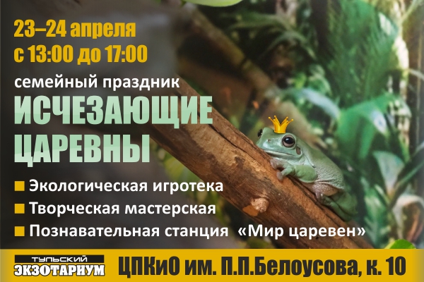 В программе меприятия - интерактивные станции с лягушками, творческие мастерские и открытие фотовыставки «Исчезающие царевны». На ней можно будет узнать невероятные и малоизвестные факты о представленных лягушках, о значении земноводных для природы и человека, о том, что им угрожает и как бороться с этими угрозами.