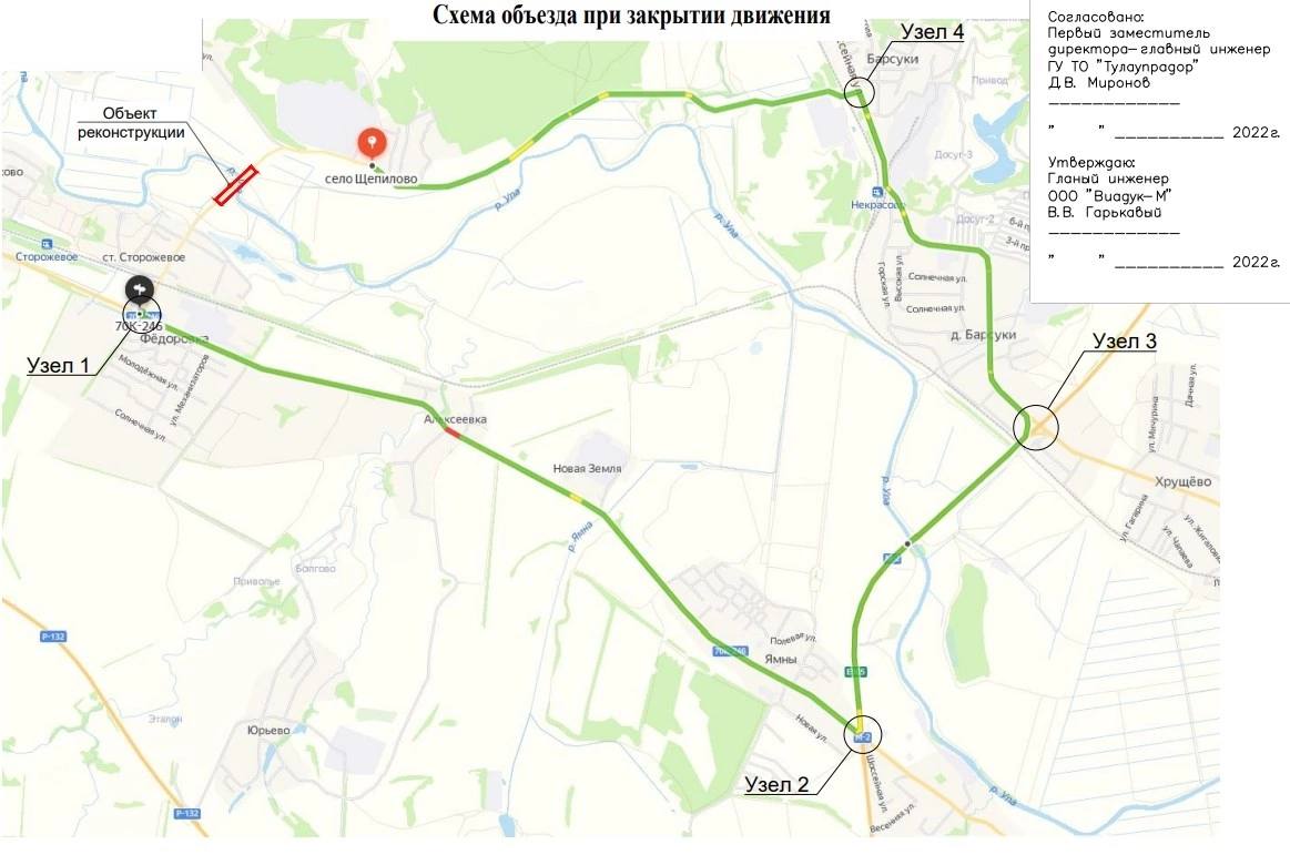 Полное закрытие дорожного движения по мосту запланировано на 6 июня в 10.00. Объезд от села Щепилово до села Федоровка будет доступен через автодорогу М2 «Крым» и автодорогу «Тула – Алёшня».
