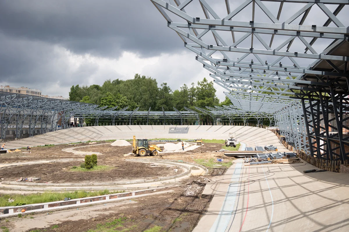 На данный момент работы ведутся с опережением графика. Идет монтаж металлоконструкций навеса и инженерных сетей. Внутри арены начато благоустройство: оборудуются велодорожки и разминочные зоны.