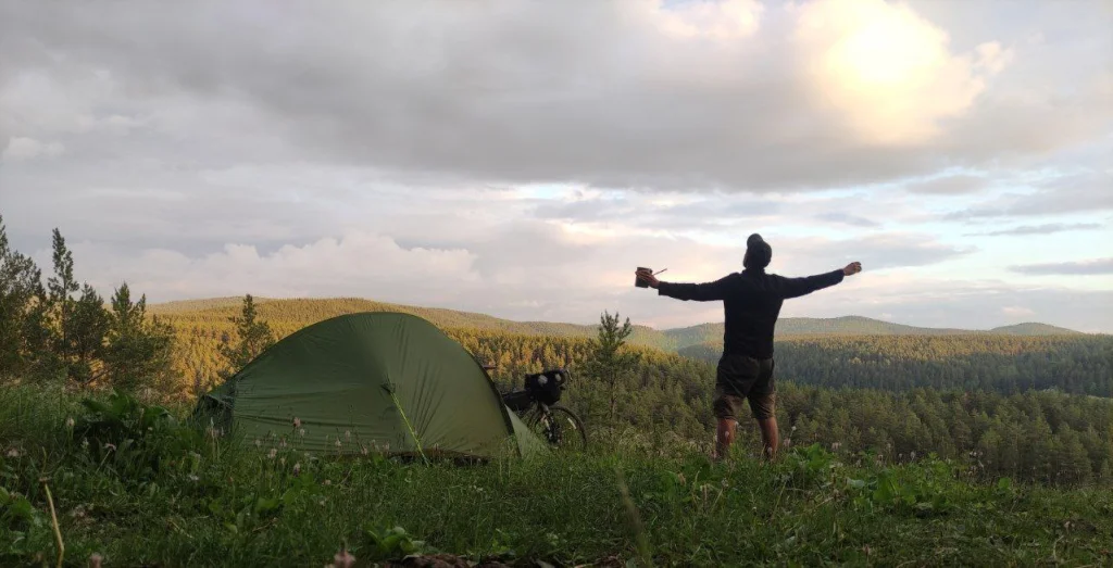 Своими успехами и впечатлениями в пути мужчина делится ежедневно в своем телеграм-канале и публикует много фото из городов и поселков, которые сейчас проезжает. За день в среднем ему удается преодолеть около 150-200 км в зависимости от погоды и качества дороги. Ночевать мужина останавливается в палатке либо хостелах.