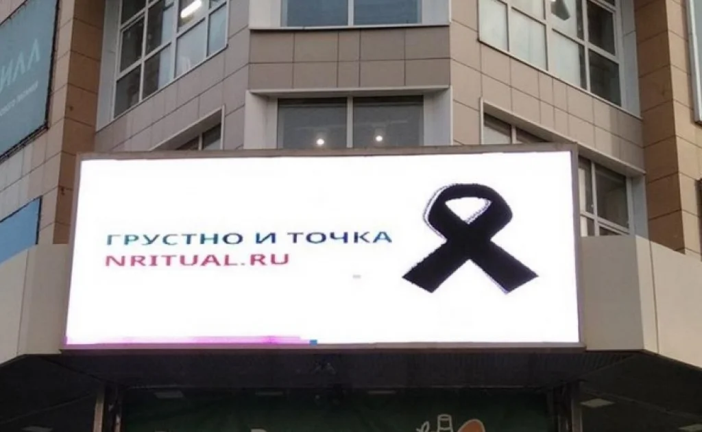 Сам баннер рекламы ритуальных услуг лаконичен: траурная ленточка и слоган. Его транслируют на экране одного из торговых комплексов в центре города.
