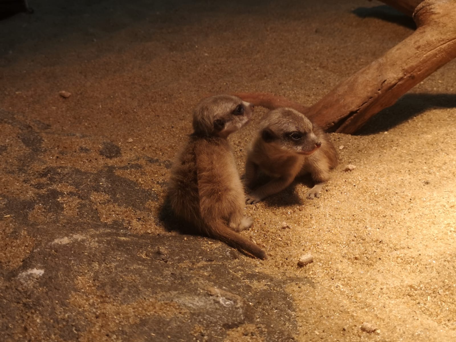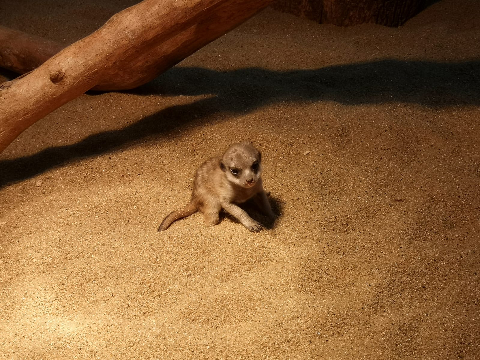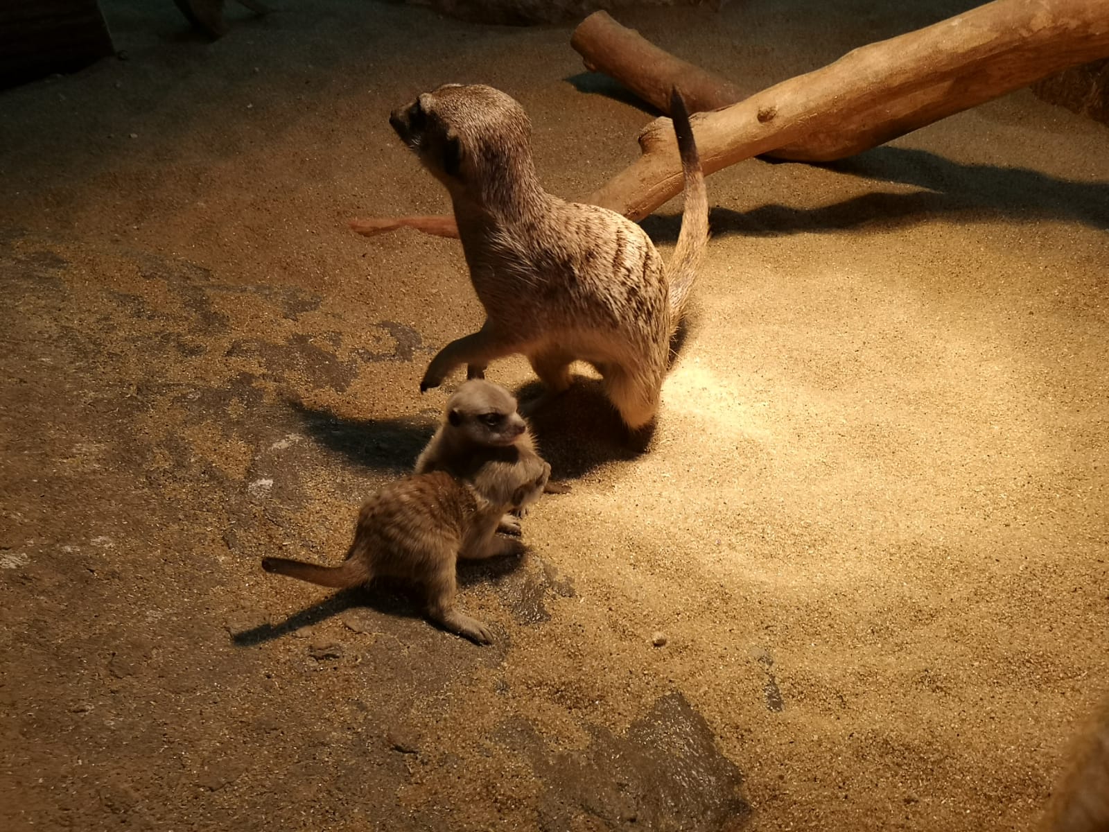 Один сурикатик оказался очень слабеньким, и его на выкорм взяли сотрудники. Оставшихся двоих Роса с гордостью демонстрирует посетителям, периодически выносит на песок из норки-укрытия.