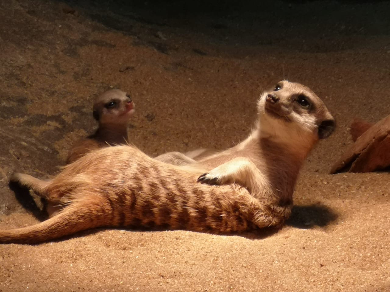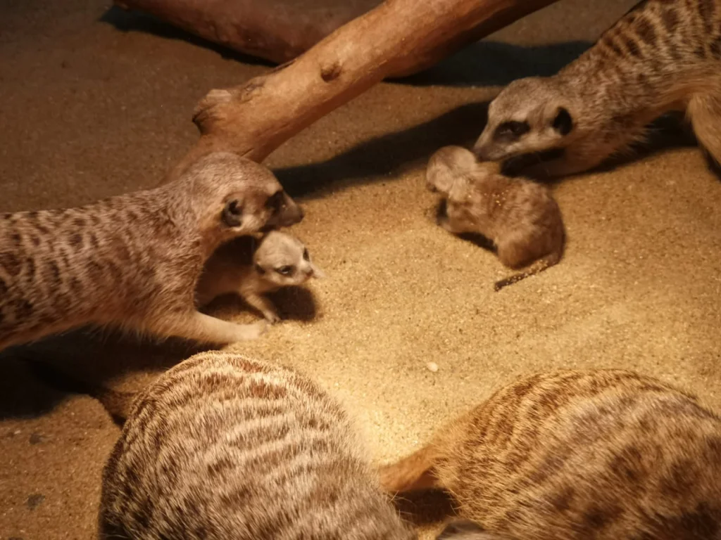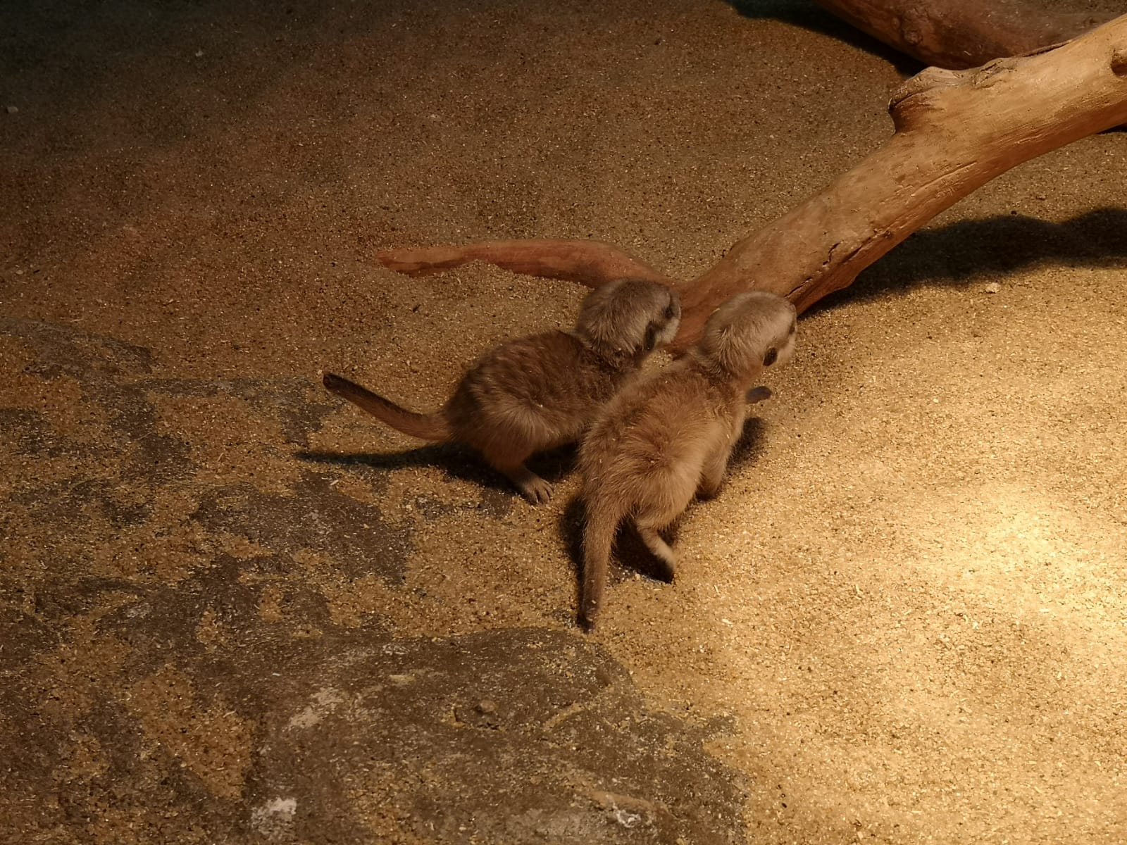 Один сурикатик оказался очень слабеньким, и его на выкорм взяли сотрудники. Оставшихся двоих Роса с гордостью демонстрирует посетителям, периодически выносит на песок из норки-укрытия.
