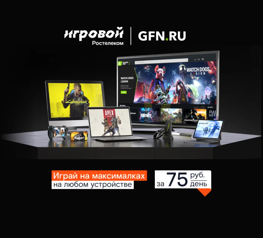 Игровой сервис GFN.RU — эксклюзивный партнер мирового лидера рынка графических процессоров и визуальных вычислений NVIDIA по развитию игрового сервиса GeForce NOW в России и странах СНГ. «Ростелеком» начал сотрудничество с GFN.RU в октябре 2019 года, что позволило геймерам запускать самые требовательные к мощности и быстродействию современные игры практически с любого персонального компьютера, сохраняя при этом преимущества графики GeForce новейшего поколения. Подписчикам доступны такие облачные игры как GenshinImpact, Fortnite, Destiny 2, «Мир Танков» и сотни других.
