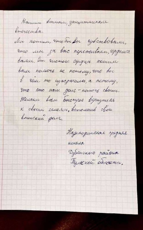 Письмо девочки из Тулы стало талисманом для бойца. Об этом сообщает Telegram-канал специального корреспондента "КП" Александра Коца.