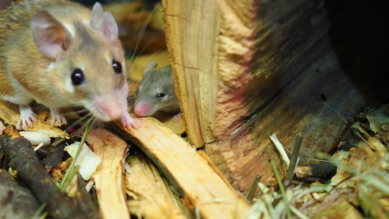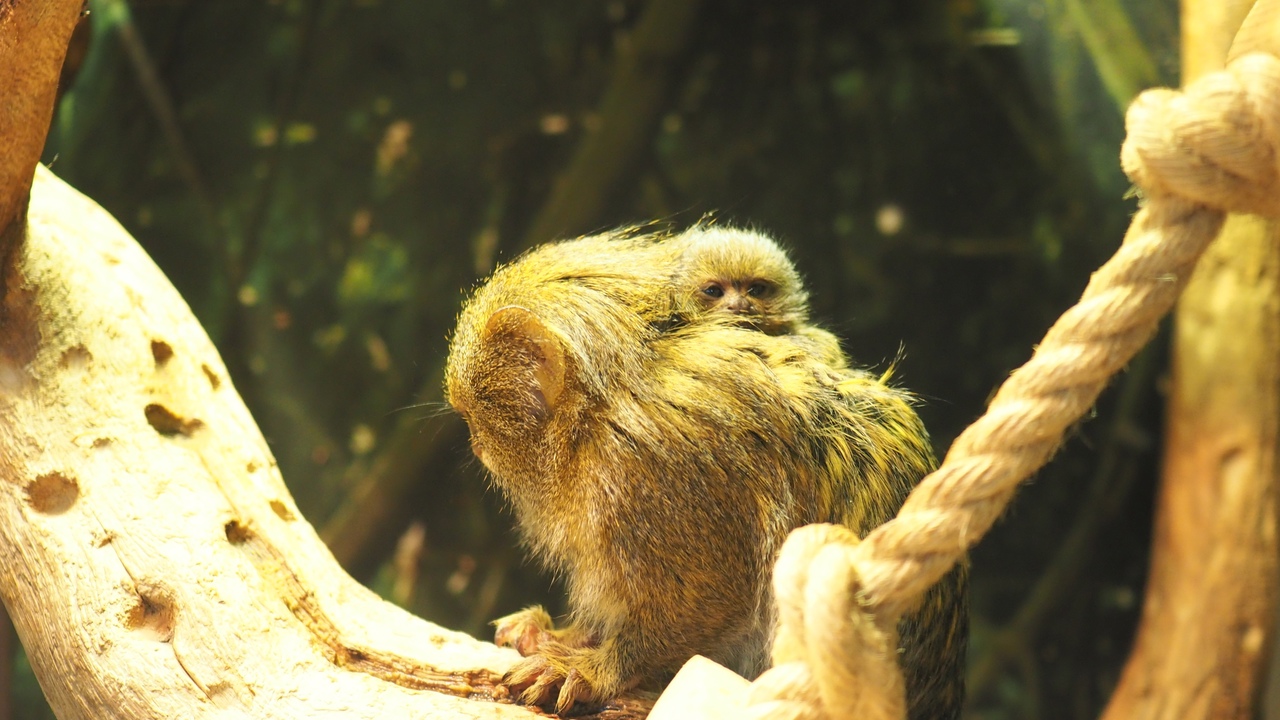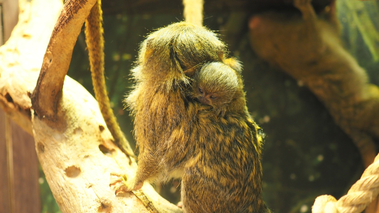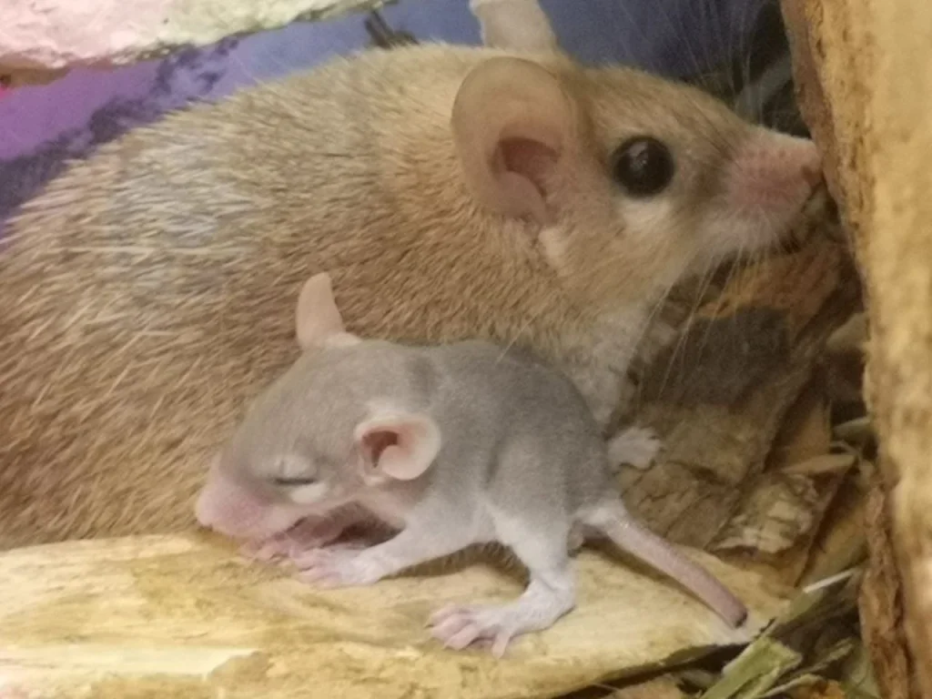В этот раз на свет появились малыши у египетских смеющихся горлиц, карликовых игрунок и иглистых мышей. Малыш-игрунка пока еще не готов к самостоятельной жизни и крепко держится за спину отца, а вот птенец горлицы и мышонок вовсю осваивают территорию и уже питаются самостоятельно.