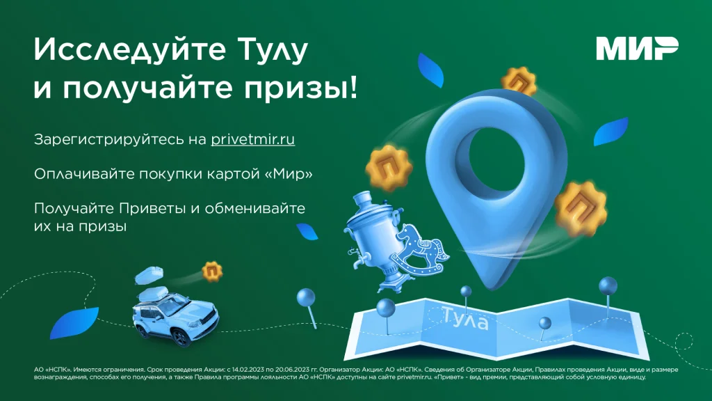 «Ростелеком» поддержал интерактивную акцию «Туристический Привет» платежной системы «Мир»1, проходящую на территории Тульской, Калужской и Орловской областей. В рамках акции владельцам карты «Мир» предлагается выполнять задания, которые связаны с посещением культурно-туристических объектов, накапливать за это виртуальные баллы (Приветы) и получать призы.