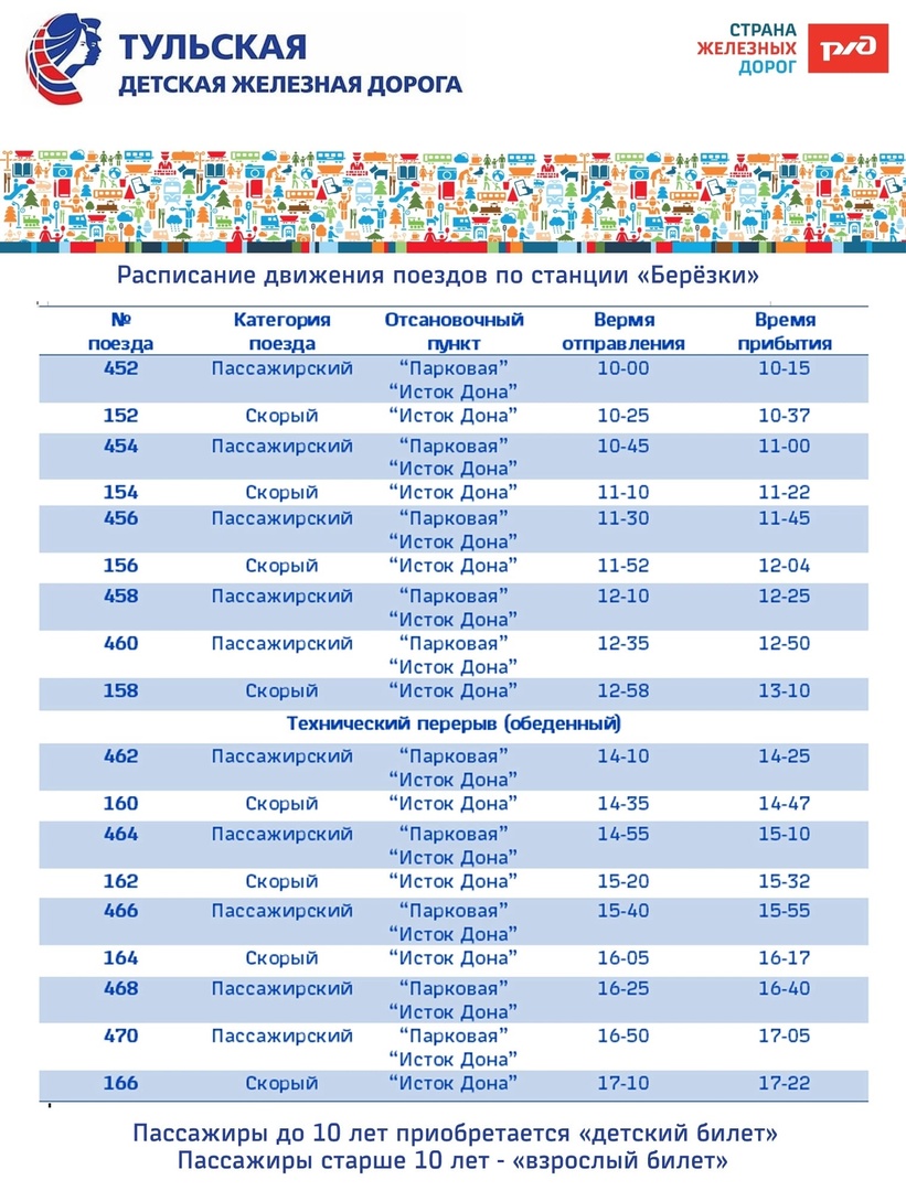 Также в официальной группе детской железной дороги опубликовано расписание движения поездов по станции Березки: