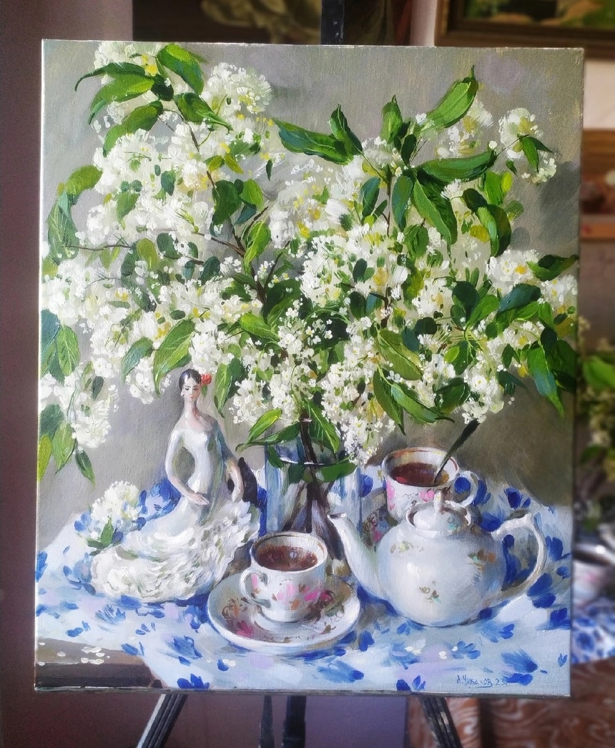 Живописные полотна, которые представлены на выставке, Антон Чубаков создавал в 2016 – 2023 годах. «Утренний натюрморт с черемухой», «Варенье из одуванчиков», «Сирень, ландыши и бабочка» - названия картин пропитаны благоуханием летнего настроения. Серия работ «Поленовские пейзажи» запечатлела виды реки Оки, окскую природу, постройки усадьбы художника Василия Поленова. И как дань любимому городу - картина «Старая Тула», на которой застыла преображенная улица Металлистов.