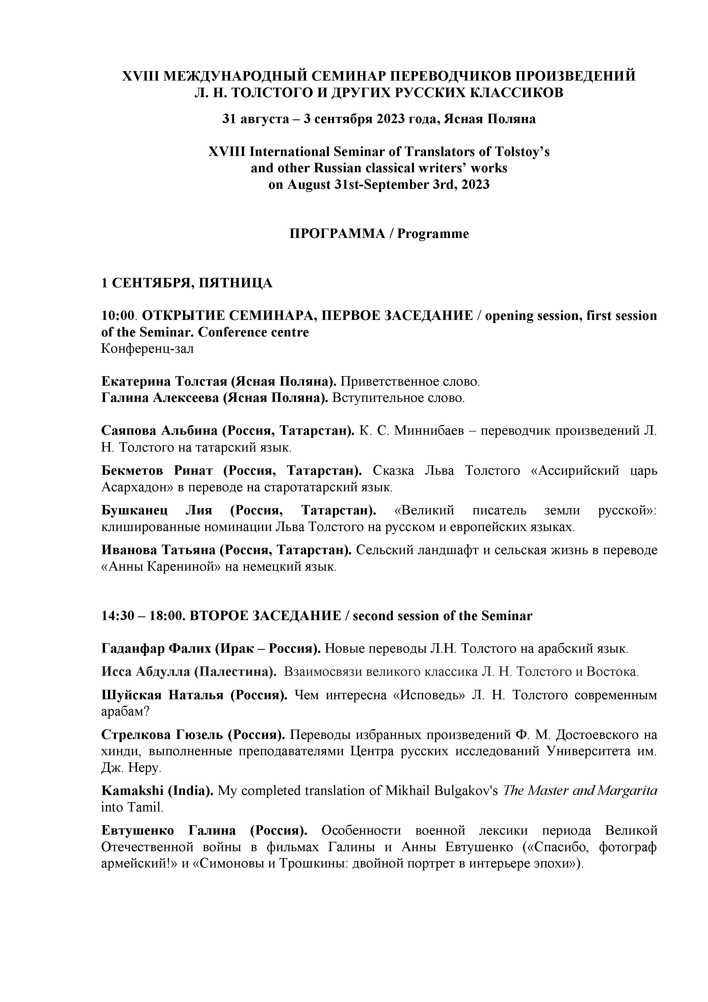 С 31 августа по 3 сентября 2023 года в Ясной Поляне состоится XVIII Международный семинар переводчиков произведений Льва Толстого и других русских классиков. В его работе примут участие более двадцати переводчиков и исследователей из России, Франции, Македонии, Турции, Ирака, Палестины и Индии.