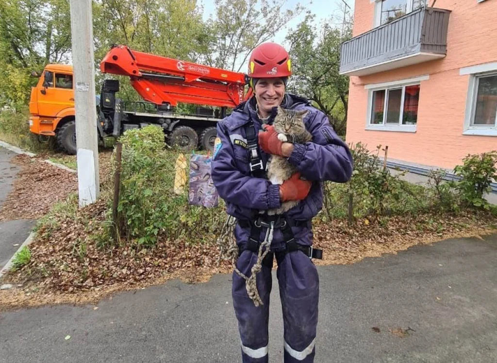 Сотрудники коммунальных служб сняли кота с дерева. Чтобы сделать это, пришлось задействовать спецтехнику и специальное