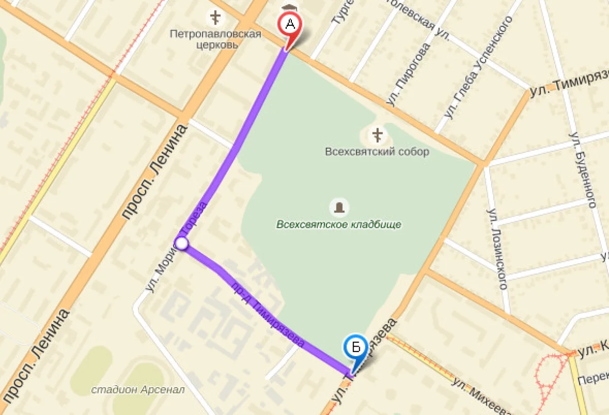 : ул. Мориса Тореза (от ул. Л. Толстого до проезда Тимирязева) и ул. пр. Тимирязева (от улицы М. Тореза до ул. Тимирязева).