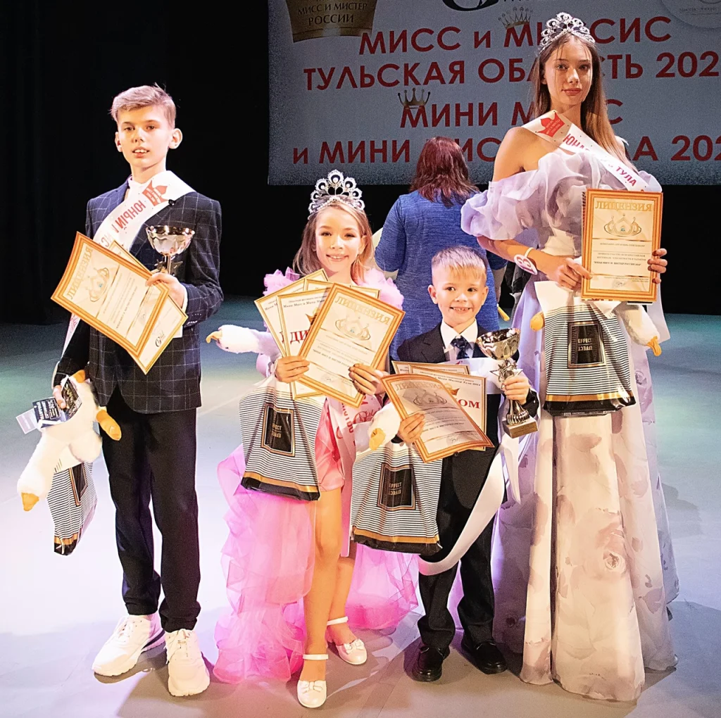 "Юная Мисс Тула 2024» - Богданова Любовь 15 лет, «Юный Мистер Тула 2024» - Митрофанов Георгий 13 лет. Гран-при «Мини Мисс Тула 2024» - Курдюмова Эмилия 10 лет, Гран-при «Мини Мистер Тула 2024» - Филатов Илья 6 лет.